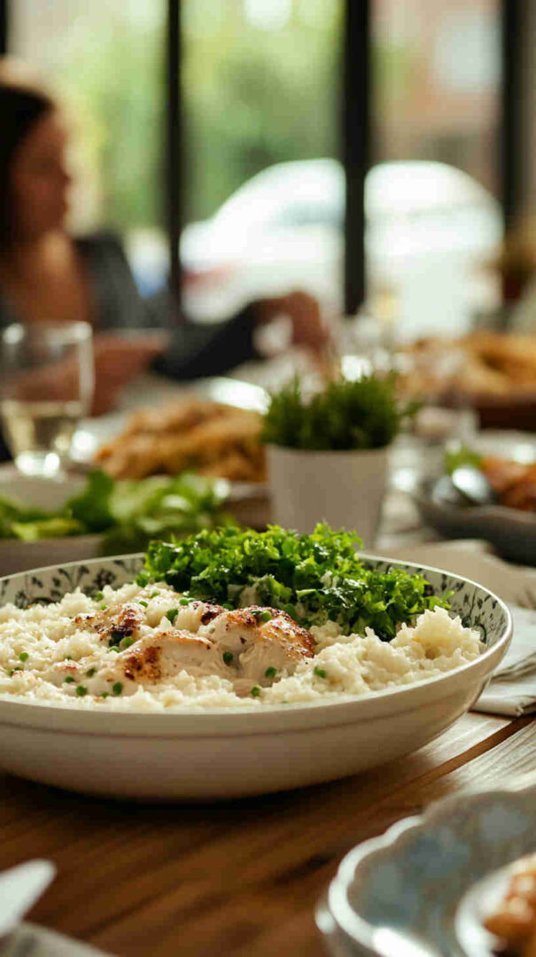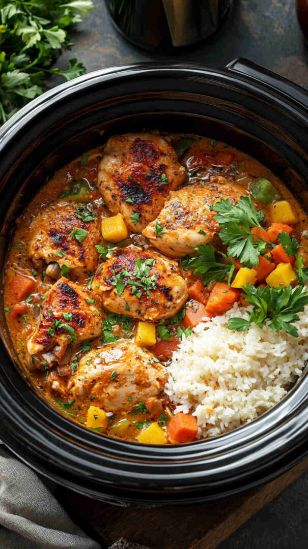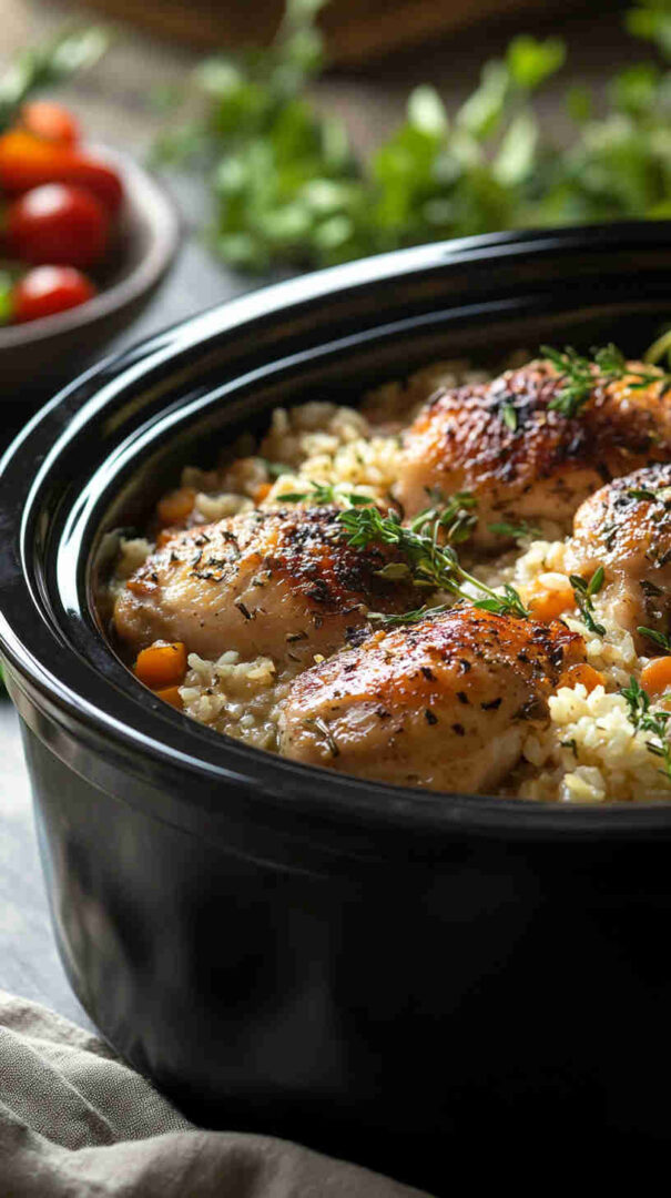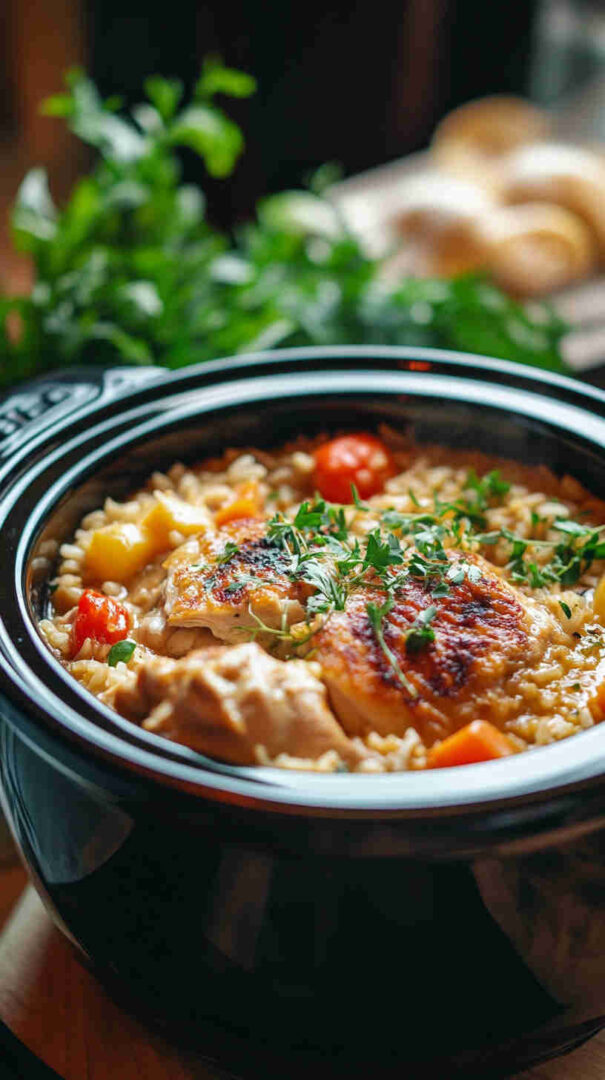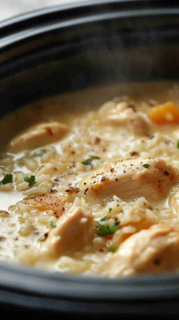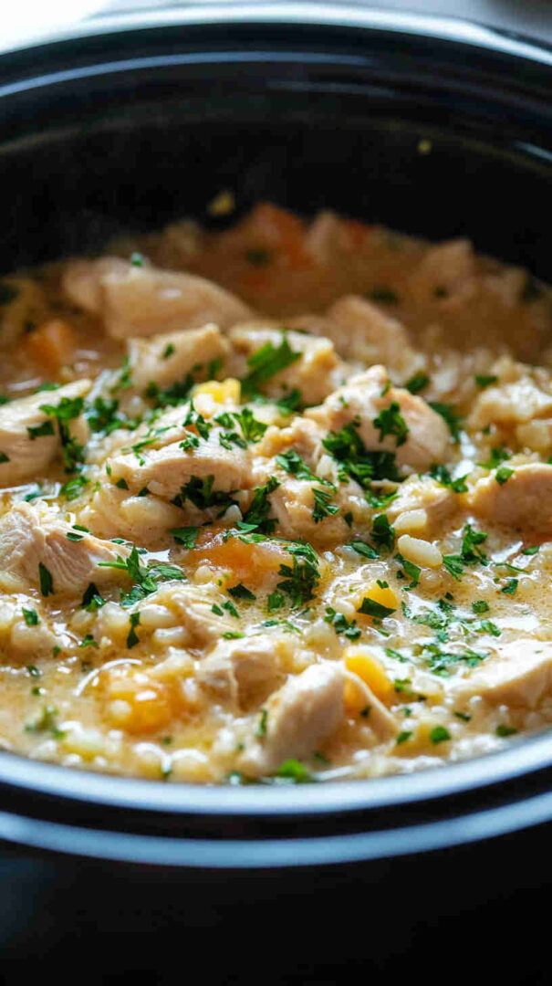 This wholesome slow-cooker creamy chicken and rice combines tender lean chicken breasts, nutty brown rice, colorful veggies like carrots, celery, and peas, plus a light, tangy creaminess from Greek yogurt and a touch of cheese. It’s a cozy, one-pot meal that’s packed with protein, fiber, and flavor—perfect for busy weeknights without the guilt.