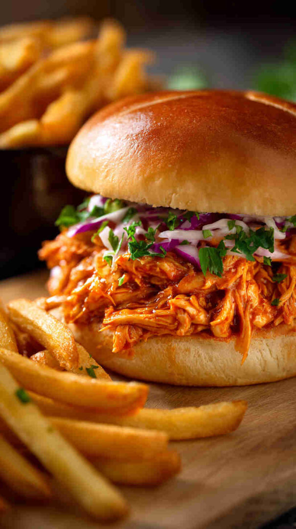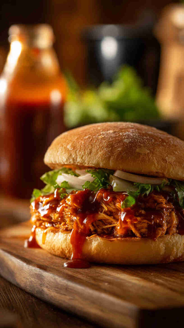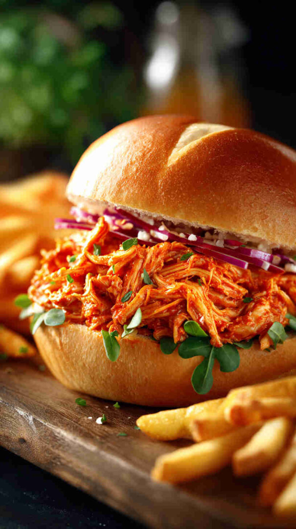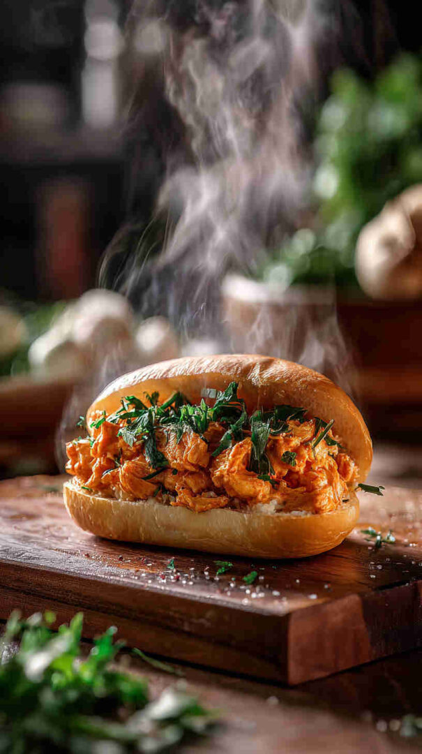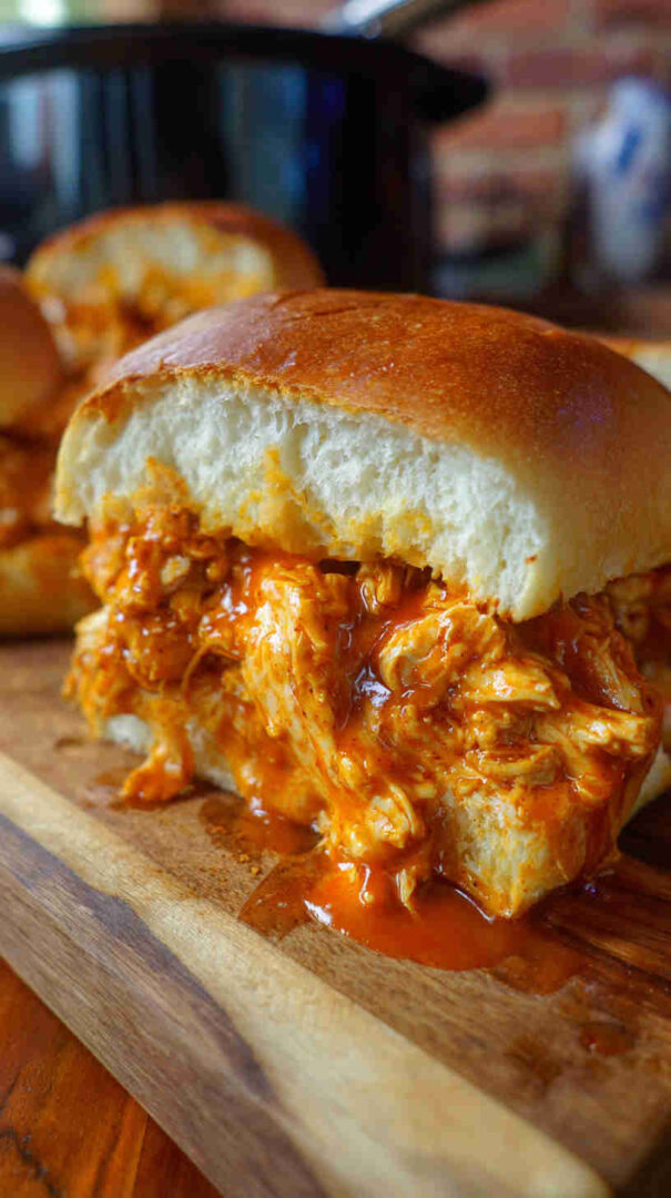 Spicy, tangy slow-cooked shredded Buffalo chicken with ranch—perfect for easy, flavorful sandwiches.