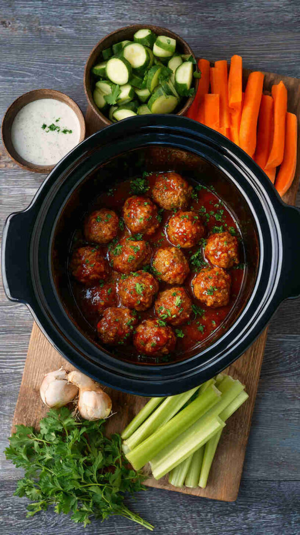 Switch to ground chicken or turkey meatballs for a lighter version — they work great and pair beautifully with the sauce. For homemade meatballs, mix ground beef/chicken with breadcrumbs, egg, parmesan, and a bit of ranch seasoning before adding to the crockpot. Dial down the heat by using mild buffalo sauce or mixing in honey for a sweet buffalo twist.