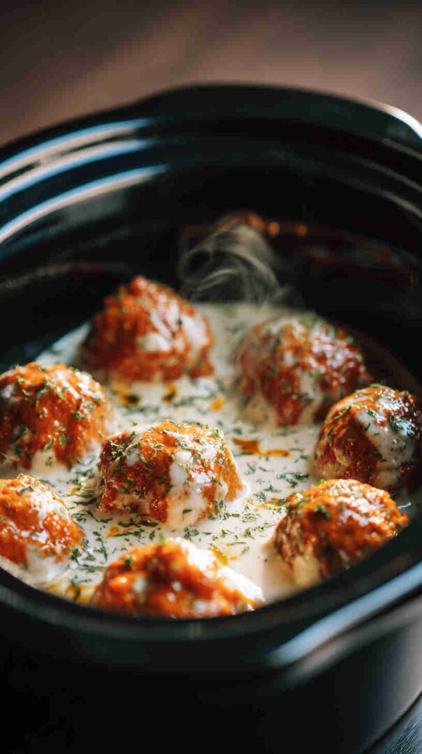 Easy slow cooker buffalo ranch meatballs: spicy, tangy, and ranch-seasoned for game days, parties, or effortless dinners.