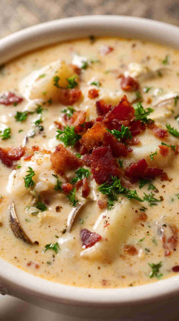 Taste and adjust seasoning at the finish—clam chowder loves a pinch more thyme or black pepper. Garnish generously with extra bacon and chives for that picture-perfect finish.