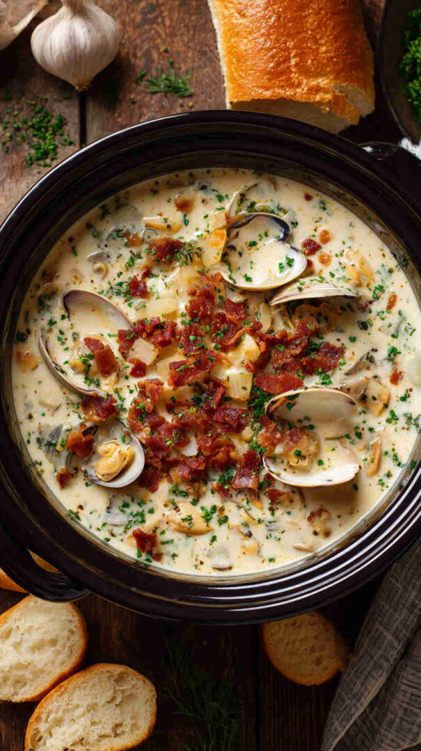 - Ladle, garnish, and enjoy every creamy spoonful! Serve hot in bowls or hollowed-out bread bowls. Top with extra crumbled bacon and plenty of chives. Pair with crusty bread or a simple green salad. This Crockpot Creamy New England Clam Chowder is pure comfort—share it with loved ones and watch smiles appear!
