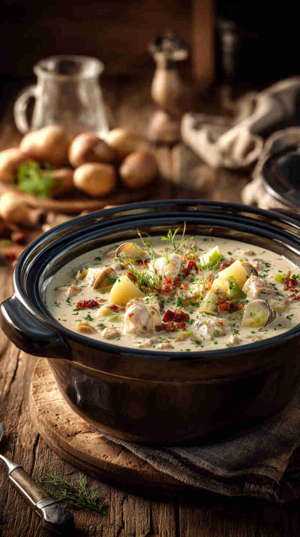 Crockpot Creamy New England Clam Chowder is a rich, velvety soup featuring tender clams, chunky potatoes, smoky bacon, and aromatic vegetables simmered slowly in a creamy broth seasoned with thyme and bay leaf. This easy slow cooker version delivers classic coastal comfort with minimal effort, perfect for chilly evenings.