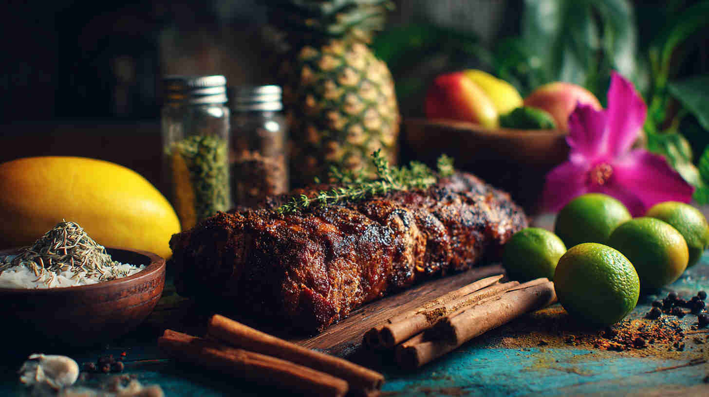 Scotch bonnet peppers bring signature fruity heat (sub habanero if unavailable). Citrus (lime/orange) brightens and tenderizes. Aromatics like garlic, onion, ginger, and thyme build depth. Brown sugar balances heat with subtle sweetness. A bit of broth or pineapple juice adds moisture and a tropical twist without overpowering.