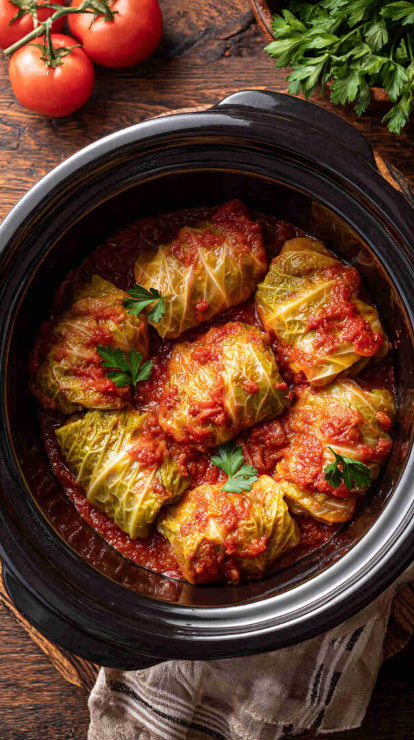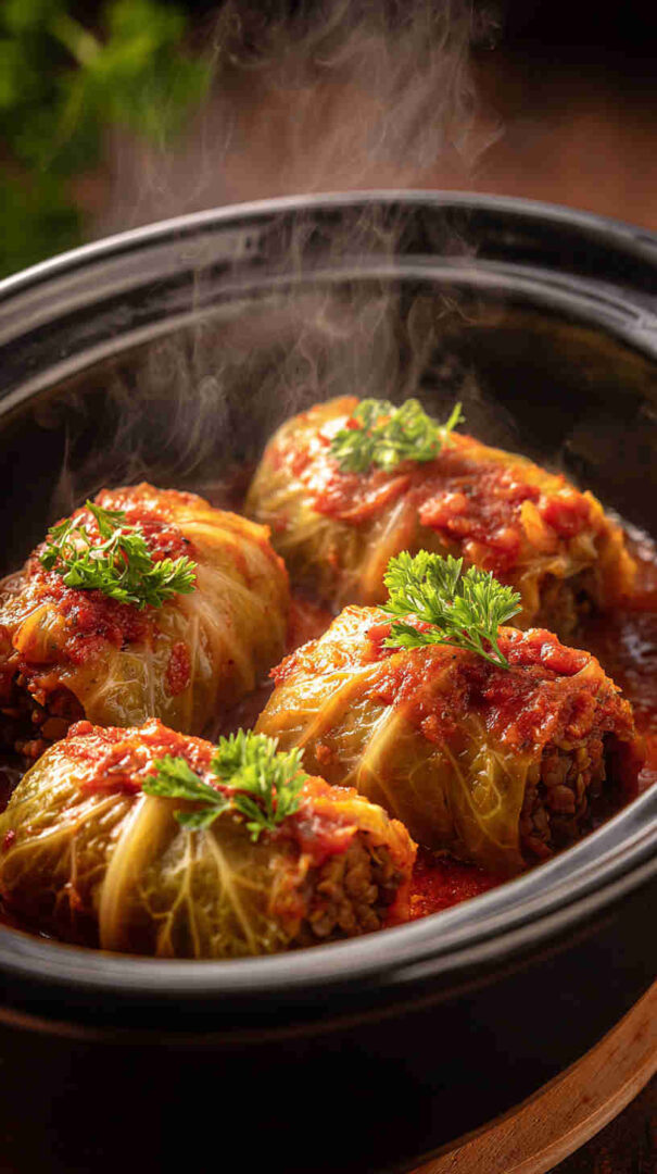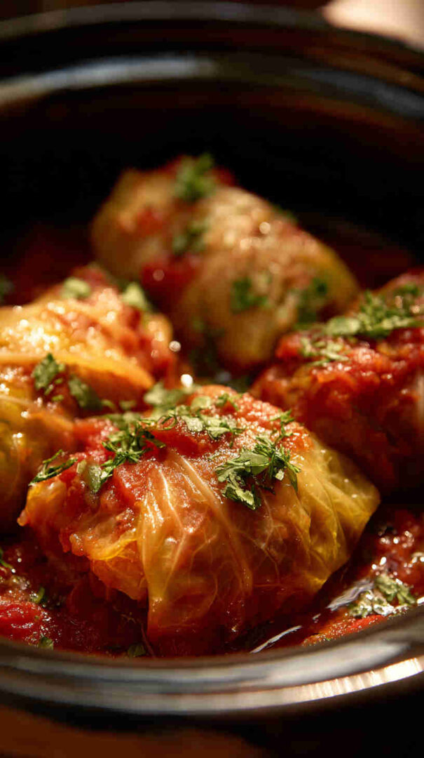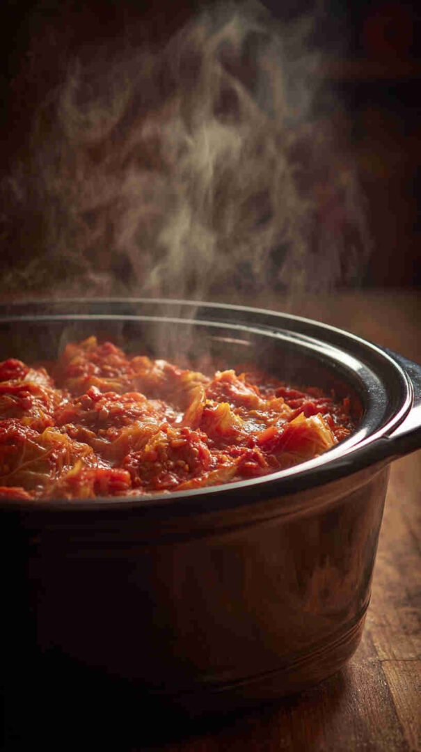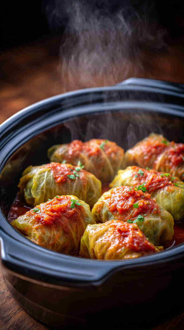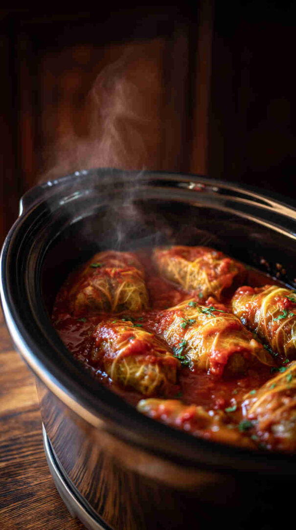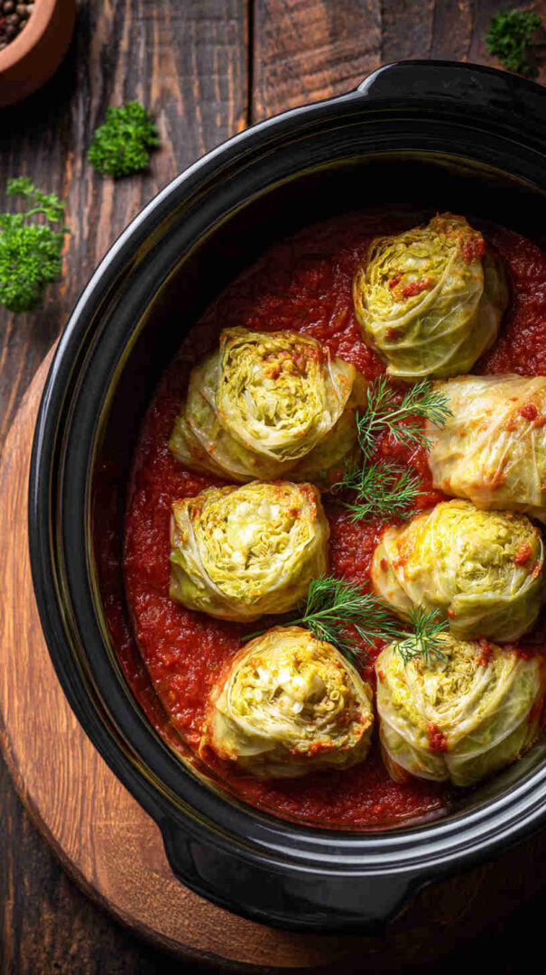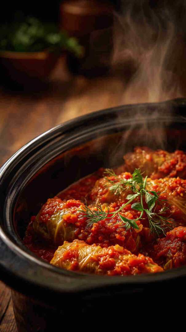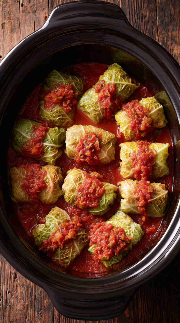 Layer extra cabbage leaves or sauce at the bottom of the crockpot to prevent sticking and add moisture. Roll the leaves tightly but not too tight—leave a little room for the filling to expand. Taste the sauce before adding the rolls and adjust seasoning generously. For extra richness, stir a splash of olive oil or a dollop of tomato paste into the sauce.