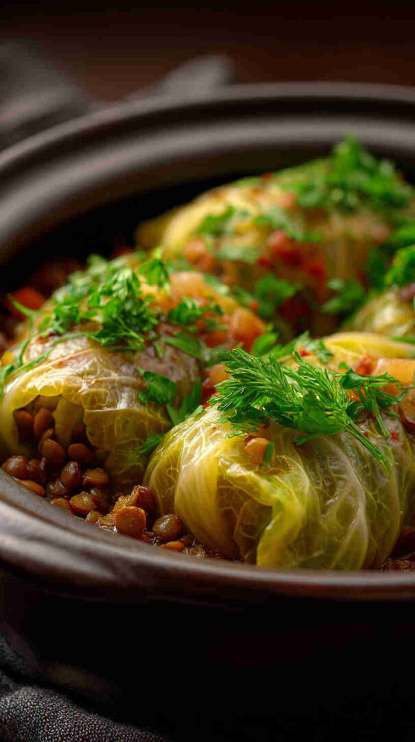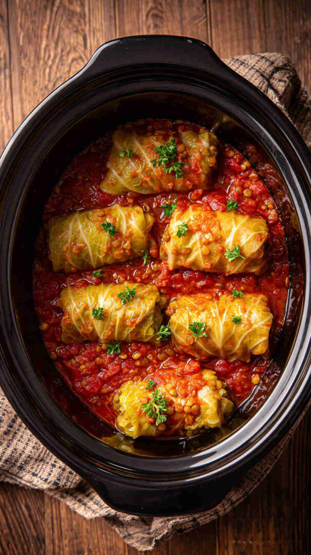 - Serve with warmth and joy! Carefully lift the cabbage rolls onto plates using a slotted spoon. Spoon plenty of the rich tomato sauce over each serving. Garnish with extra chopped parsley and serve with crusty bread, mashed potatoes, or a simple green salad. These Crockpot Lentil-Stuffed Cabbage Rolls are wholesome, satisfying, and full of love—enjoy every comforting bite with family or friends!