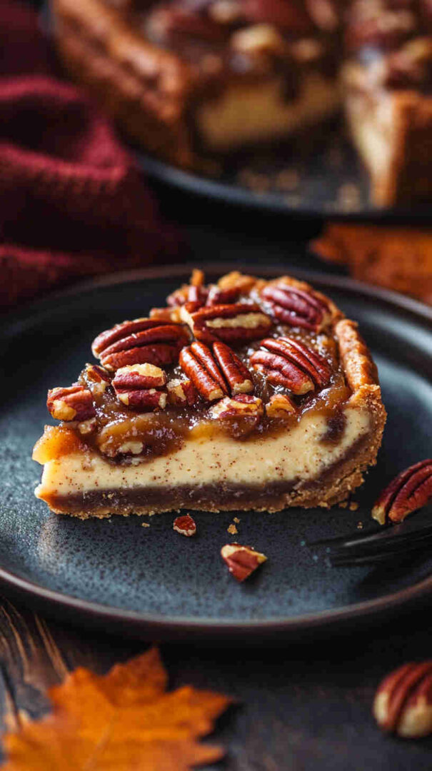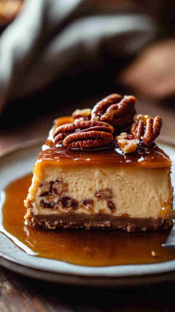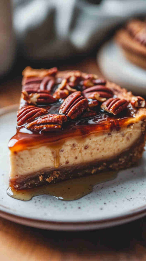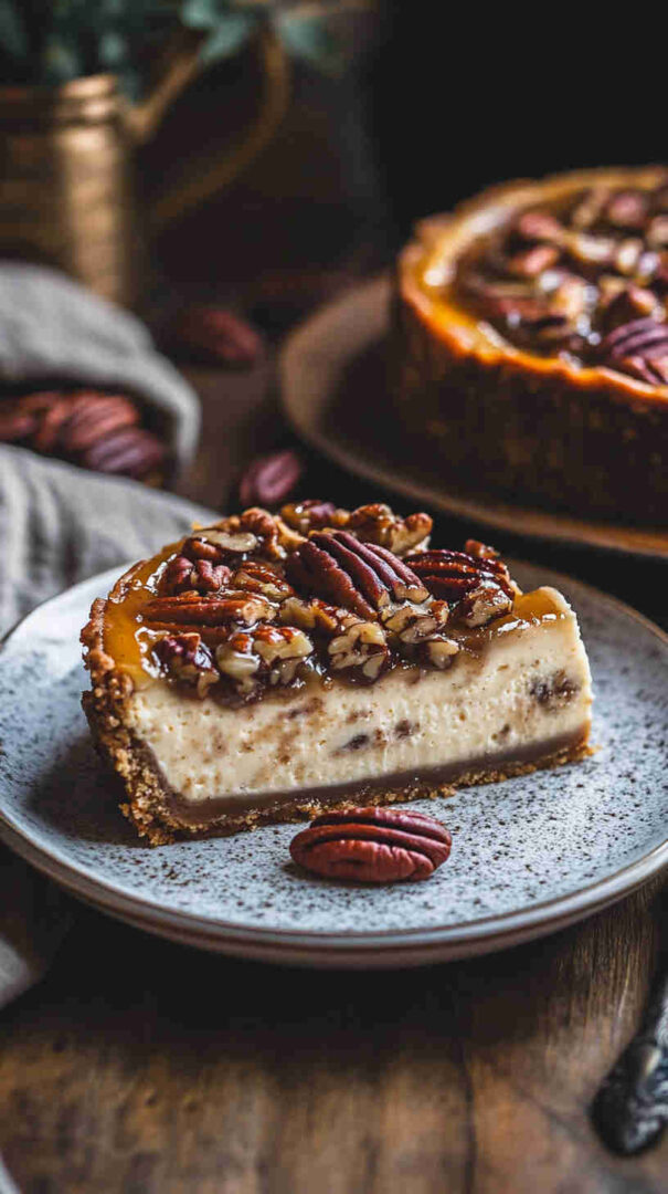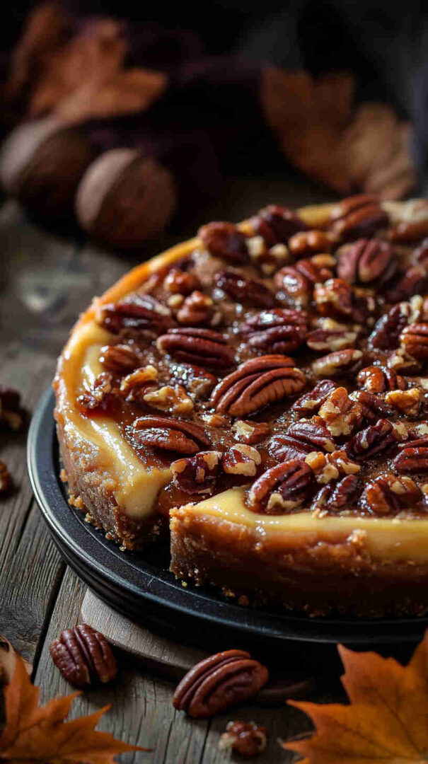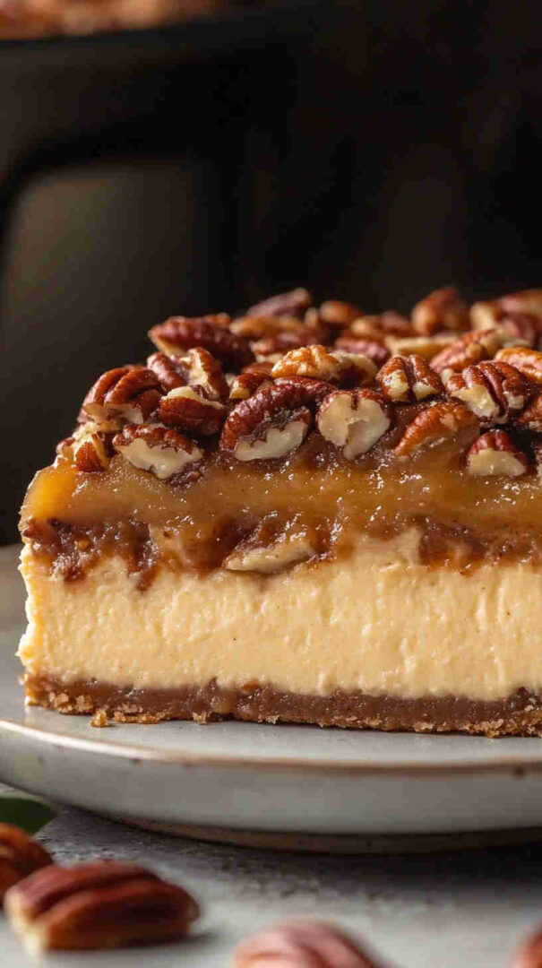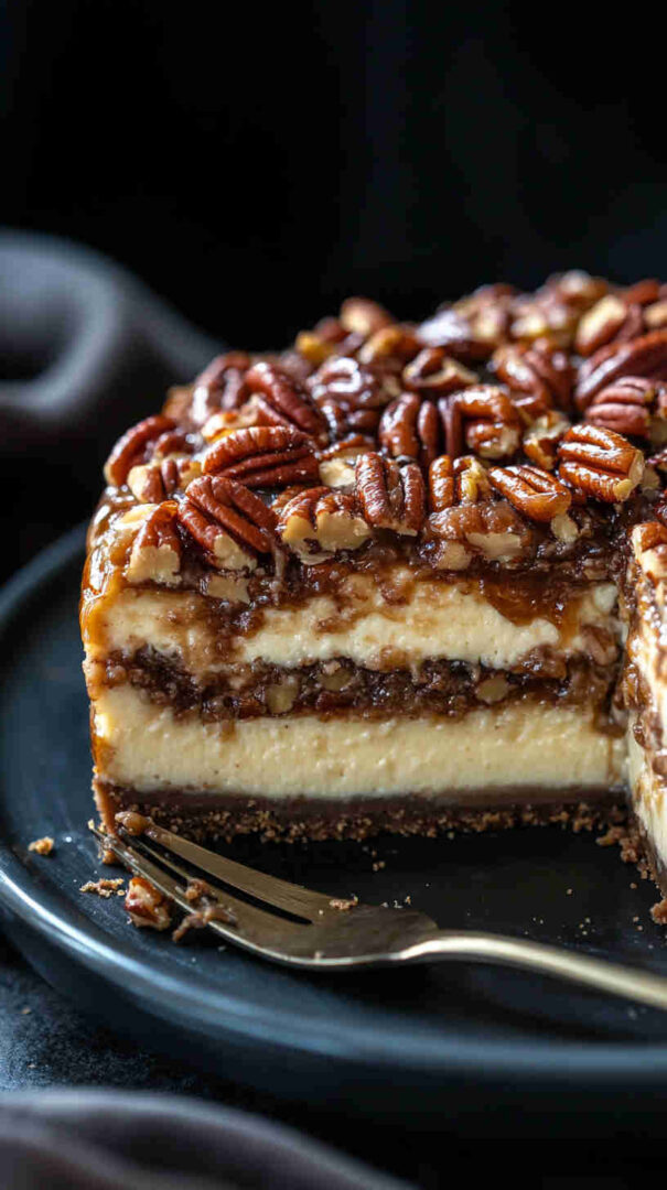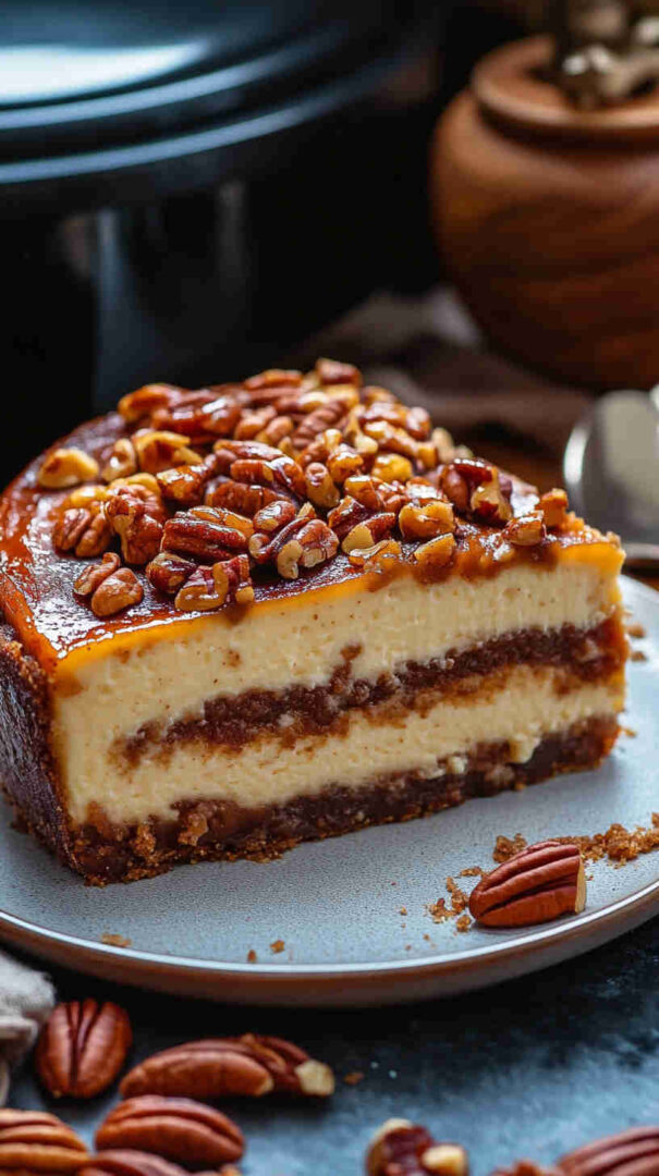 Creamy slow-cooker cheesecake with buttery crust and gooey pecan pie topping—easy, decadent holiday dessert perfection.