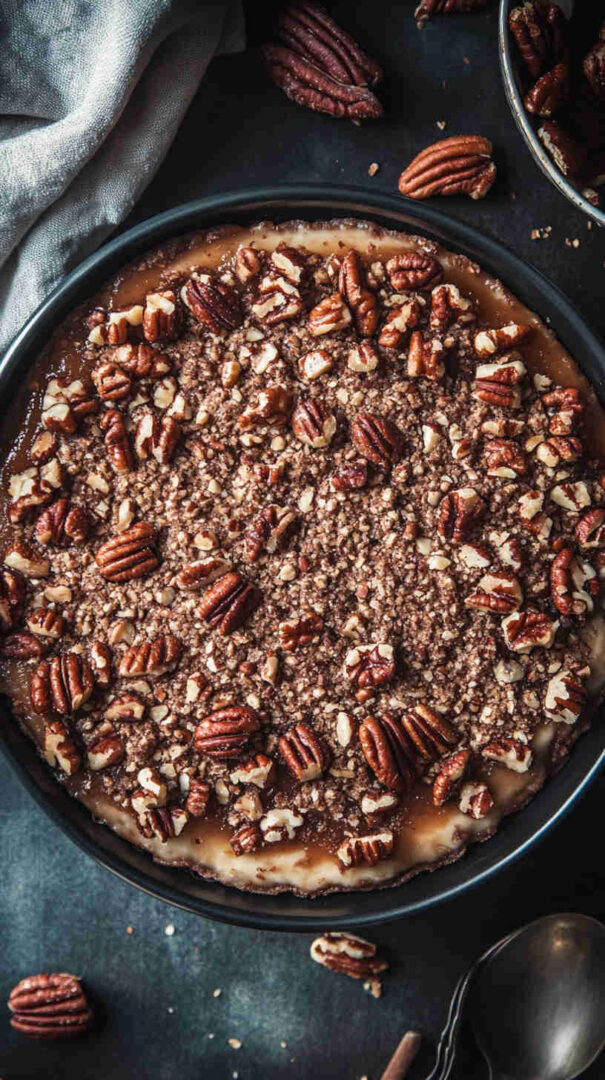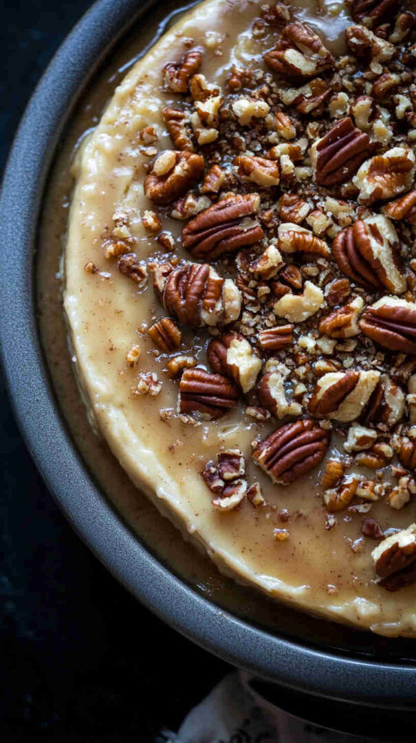 - Layer it on. Gently spoon the pecan mixture evenly over the cheesecake filling—don’t stir! It will sink slightly during cooking and create that beautiful marbled effect.