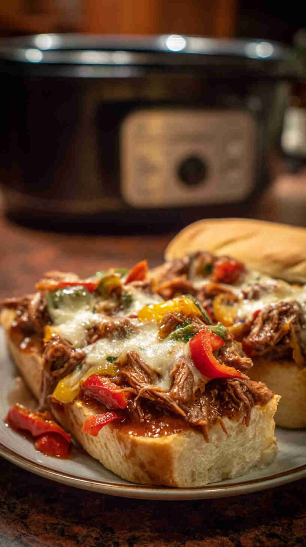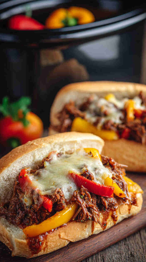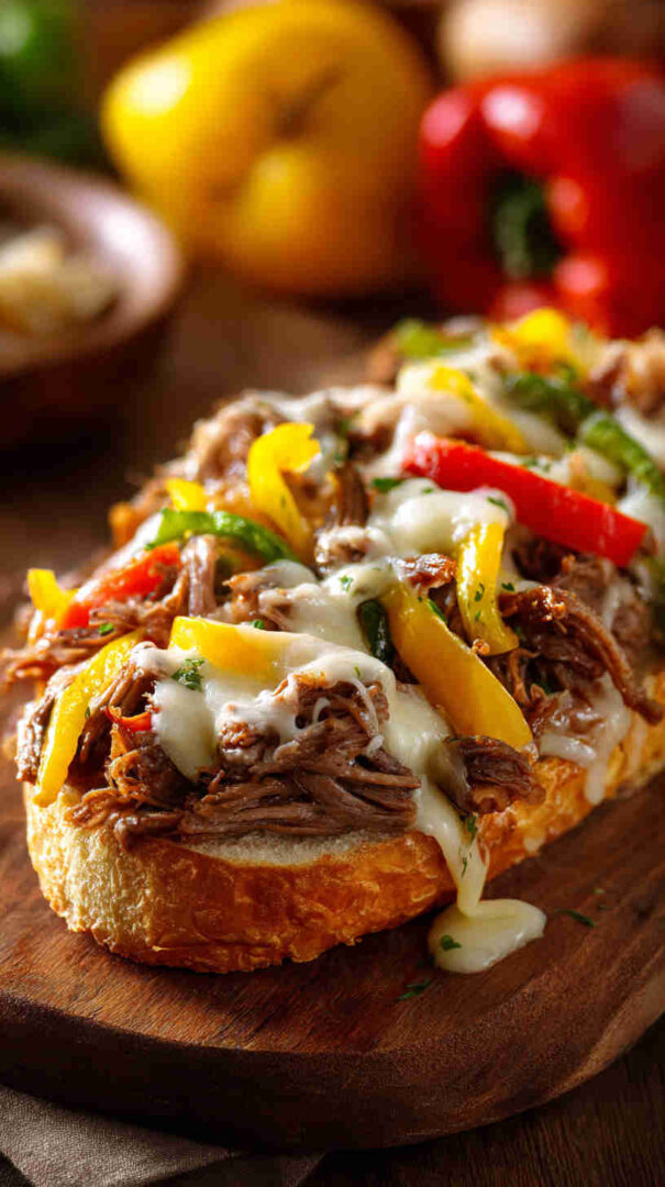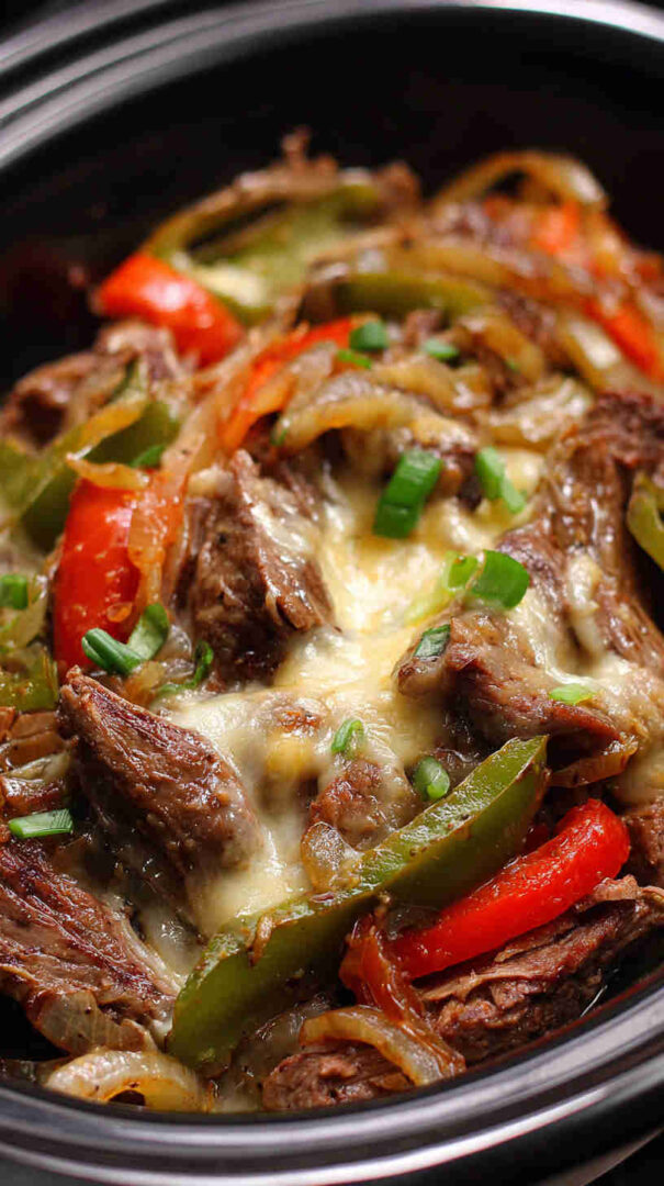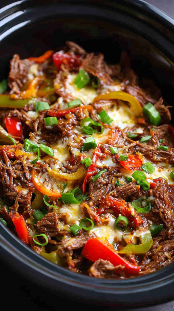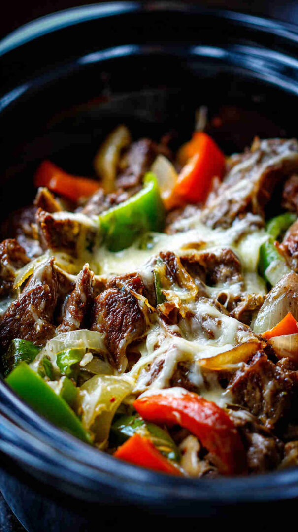 Tender slow-cooked beef with peppers, onions, and melty cheese – easy crockpot Philly cheesesteak filling for perfect sandwiches.