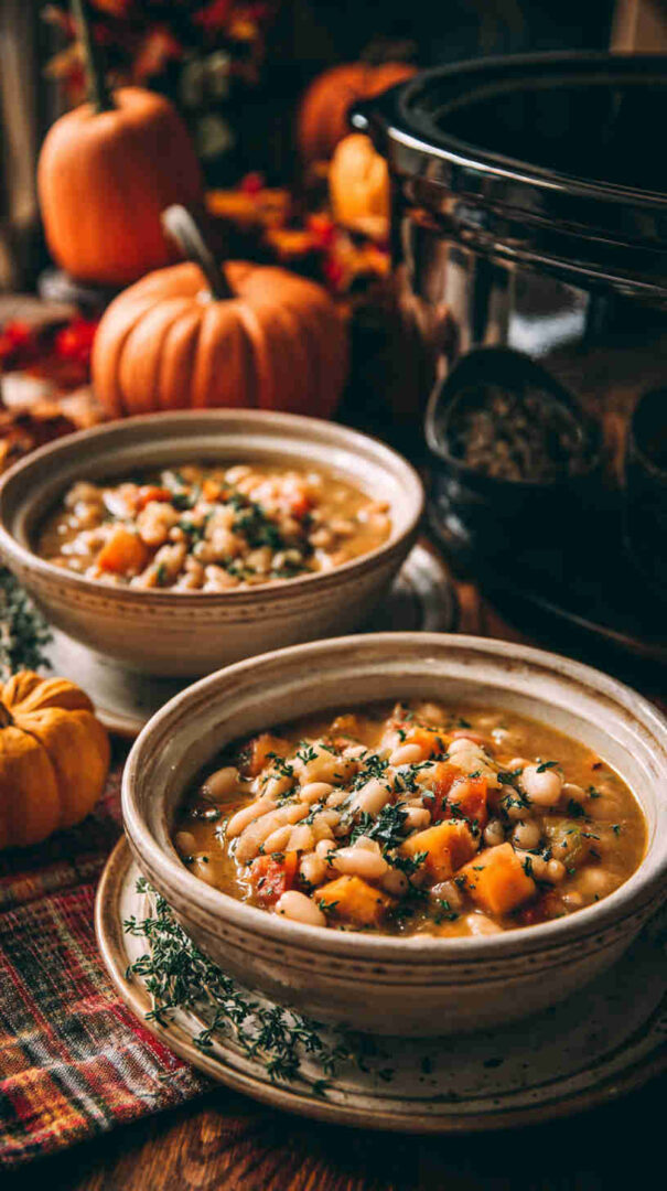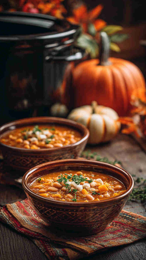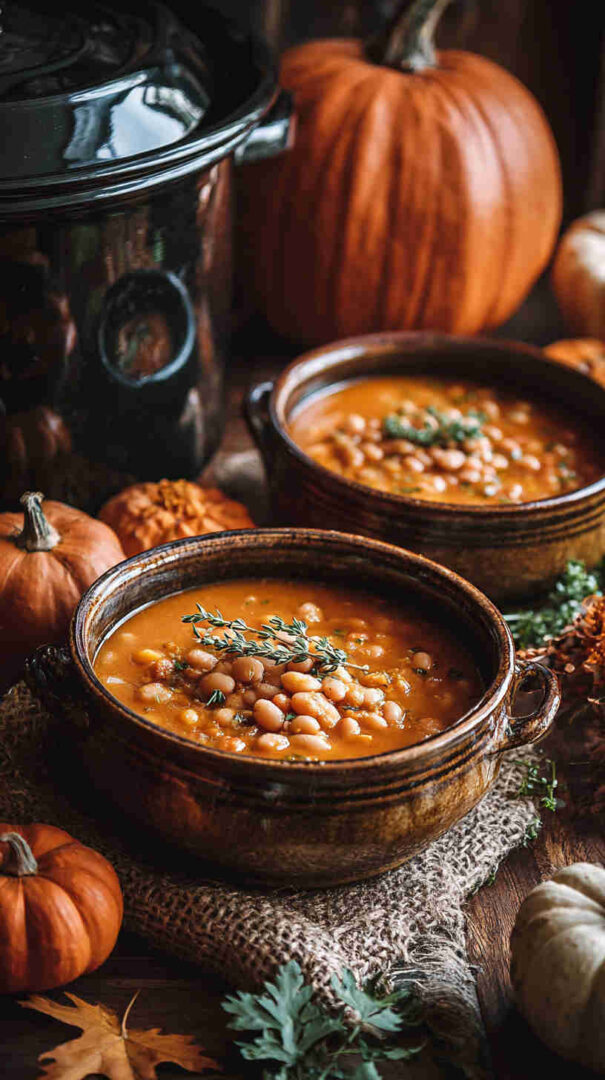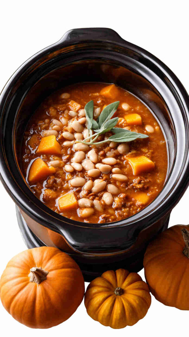 Cozy vegan crockpot chili with sweet pumpkin and creamy white beans in a warmly spiced tomato broth — fall comfort in a bowl.