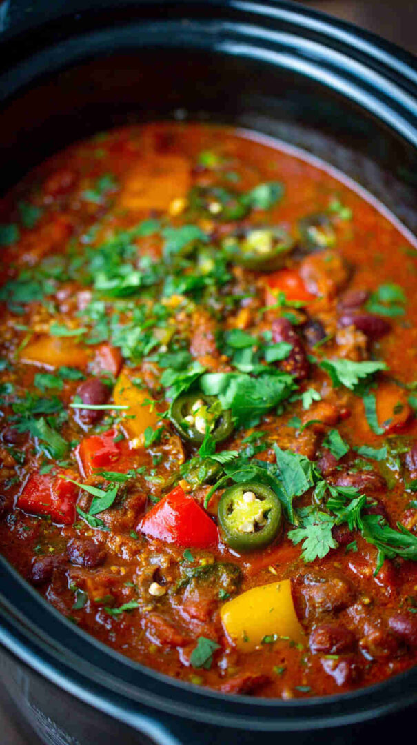 - Set it and let it simmer — Cover the crockpot and cook on LOW for 6–8 hours or on HIGH for 4 hours, until the flavors have melded and the chili is thick and fragrant.
