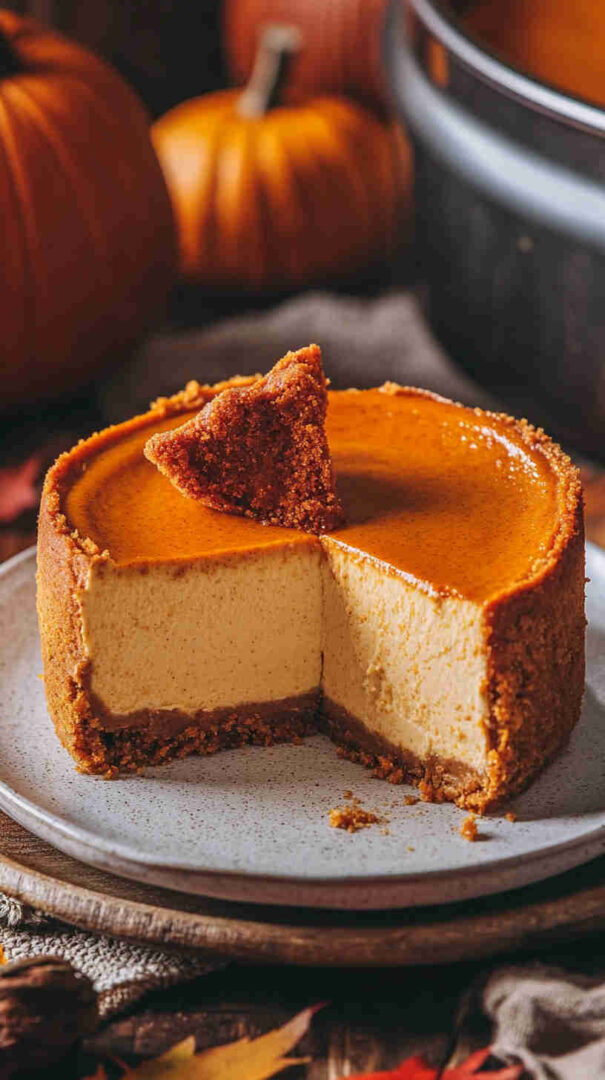 Creamy slow cooker pumpkin spice cheesecake with gingersnap crust—moist, crack-free, and full of cozy fall flavors.