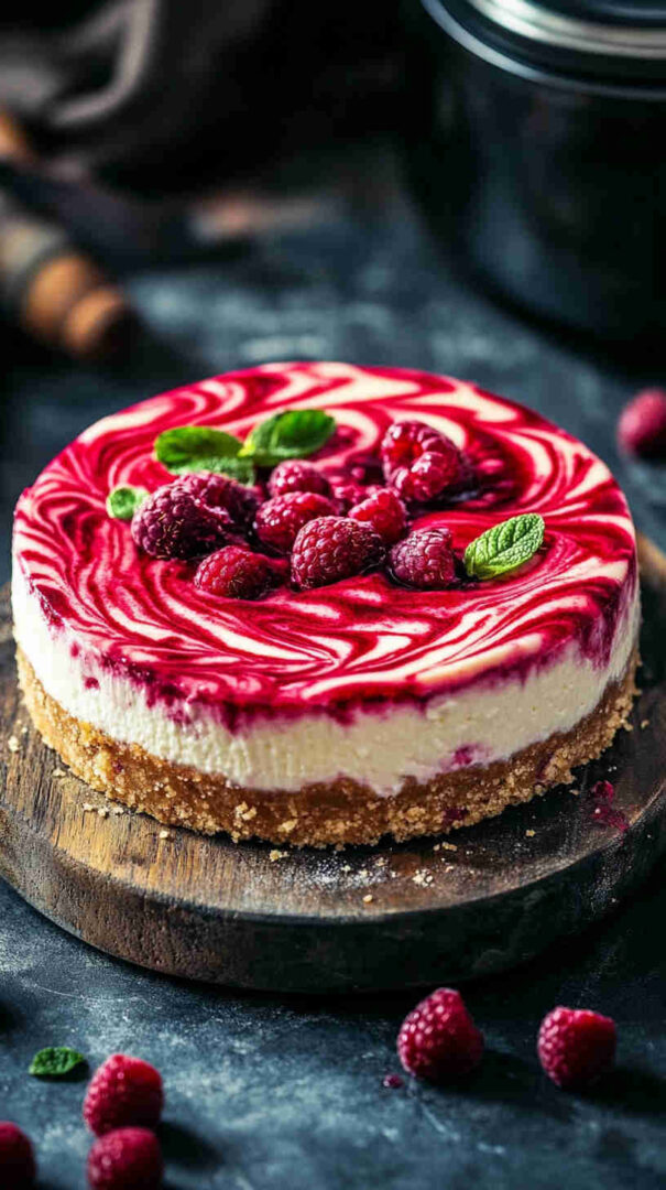 For a chocolate twist, use crushed Oreo cookies instead of graham crackers for the crust and swirl in melted dark chocolate instead of raspberry sauce. Swap raspberries for strawberries, blueberries, or blackberries — each creates a different but equally gorgeous ripple effect. For a lemon-raspberry version, add 2–3 tablespoons of fresh lemon zest and juice to the filling.