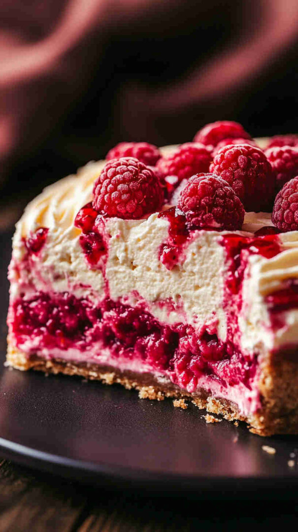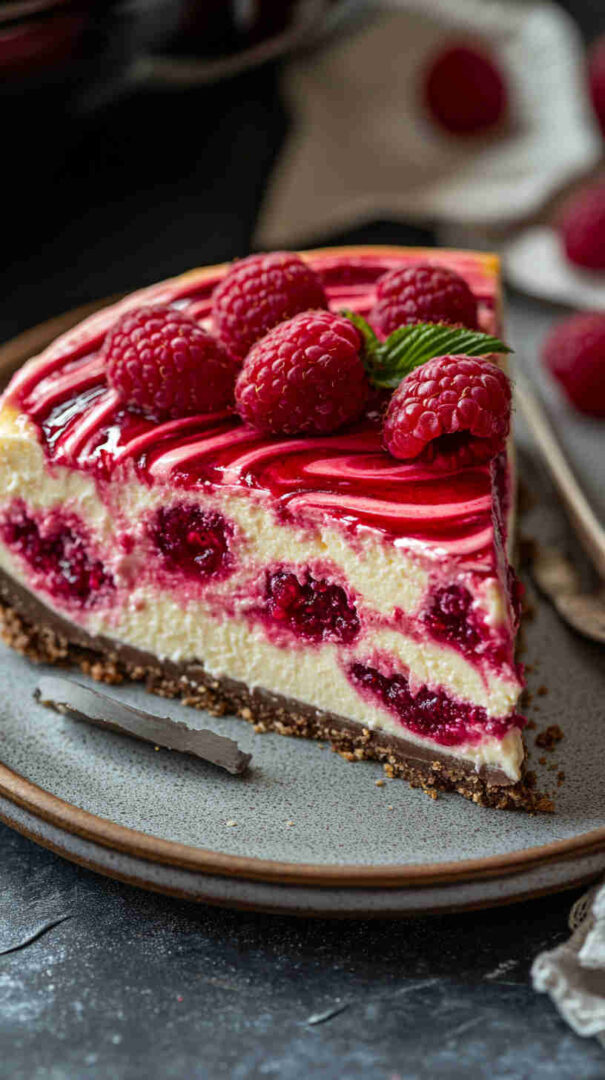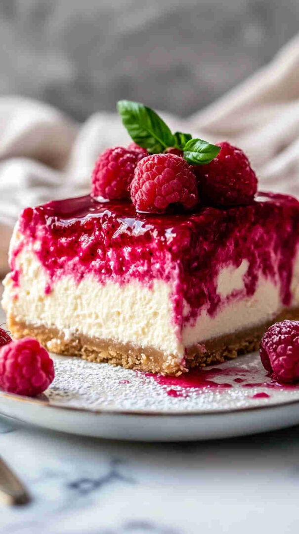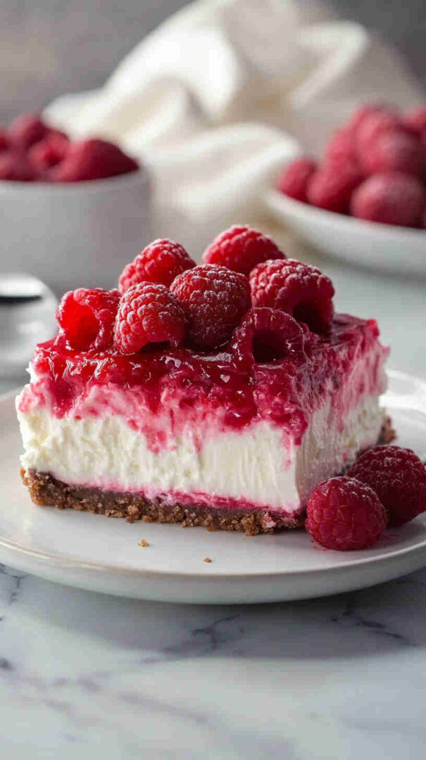 - Chill, slice, and wow everyone — Remove pan, uncover, and refrigerate at least 6 hours (overnight is best). Run a knife around the edge, release the springform, slice with a hot knife for clean cuts, and serve with extra raspberries or whipped cream if you’re feeling fancy!