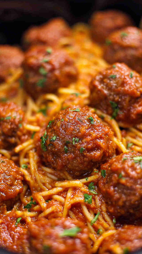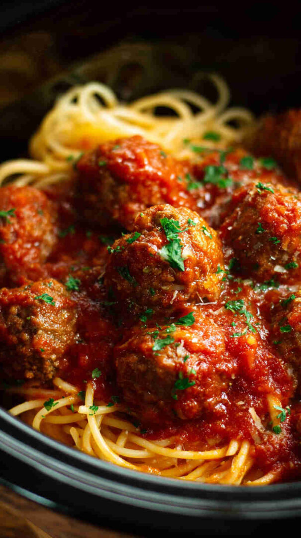 Easy slow cooker spaghetti and meatballs — tender meatballs and pasta cooked together in rich sauce for a hassle-free family dinner.