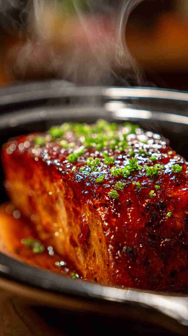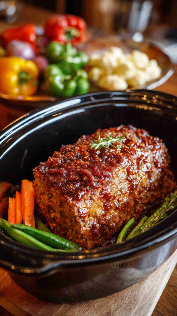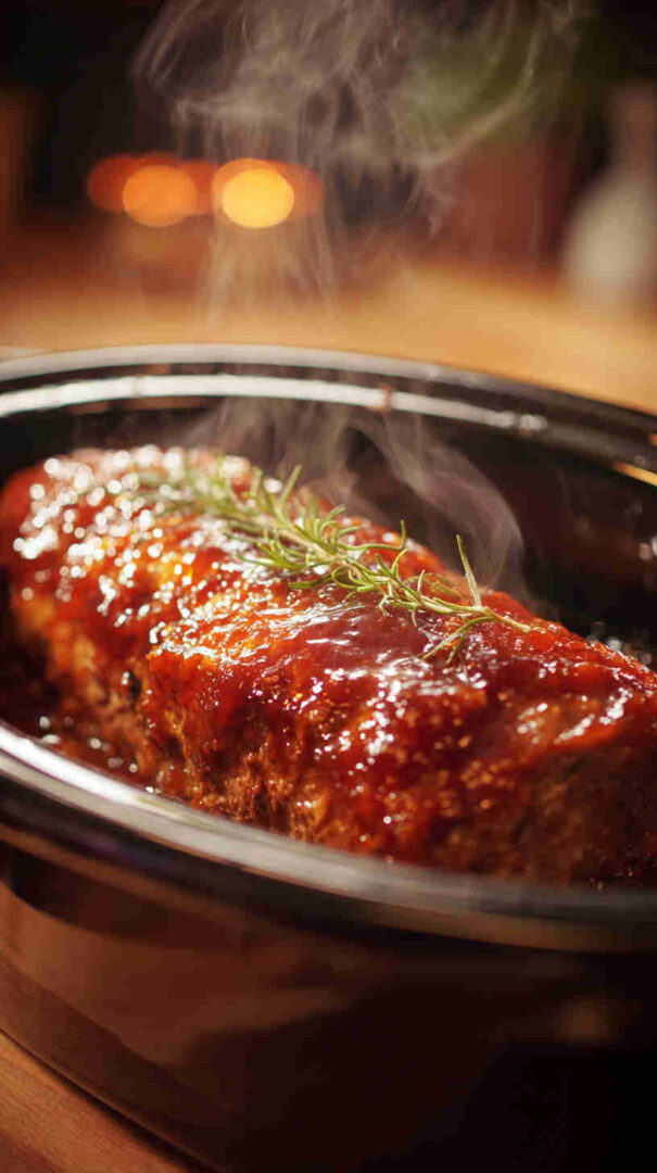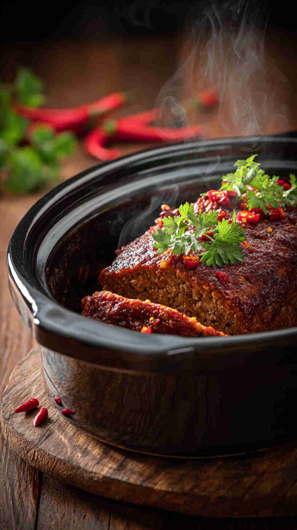 Juicy slow cooker meatloaf topped with sticky sweet chili glaze—easy, flavorful comfort food for busy days.