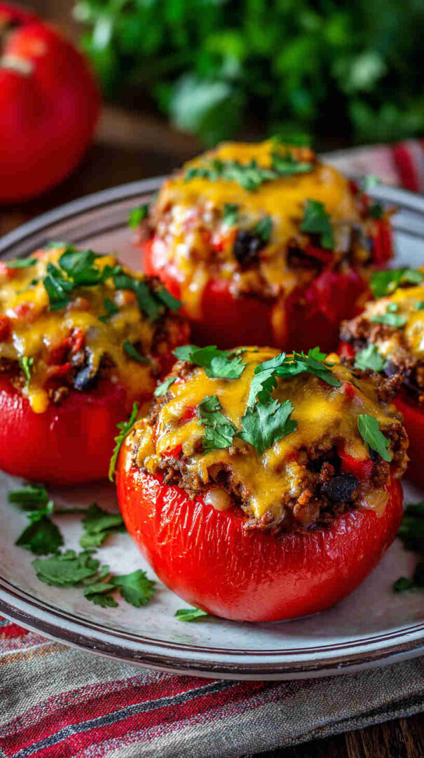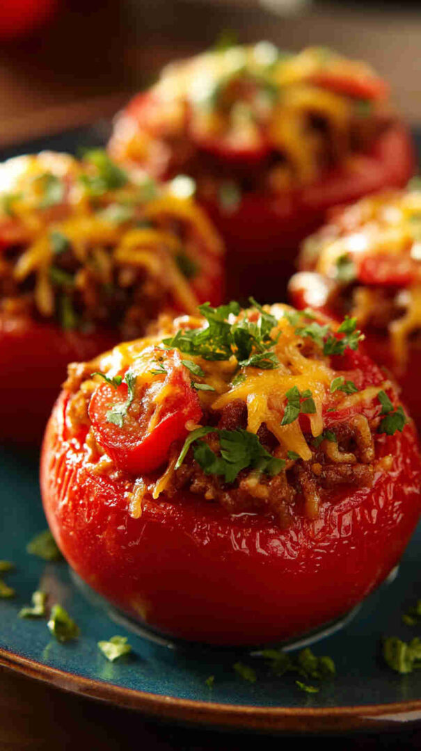 Make these stuffed tomatoes your own by swapping ground beef for turkey, chicken, or plant-based crumbles for a lighter or vegetarian version. Add diced jalapeños or green chilies for extra heat, or include quinoa instead of rice for more protein.