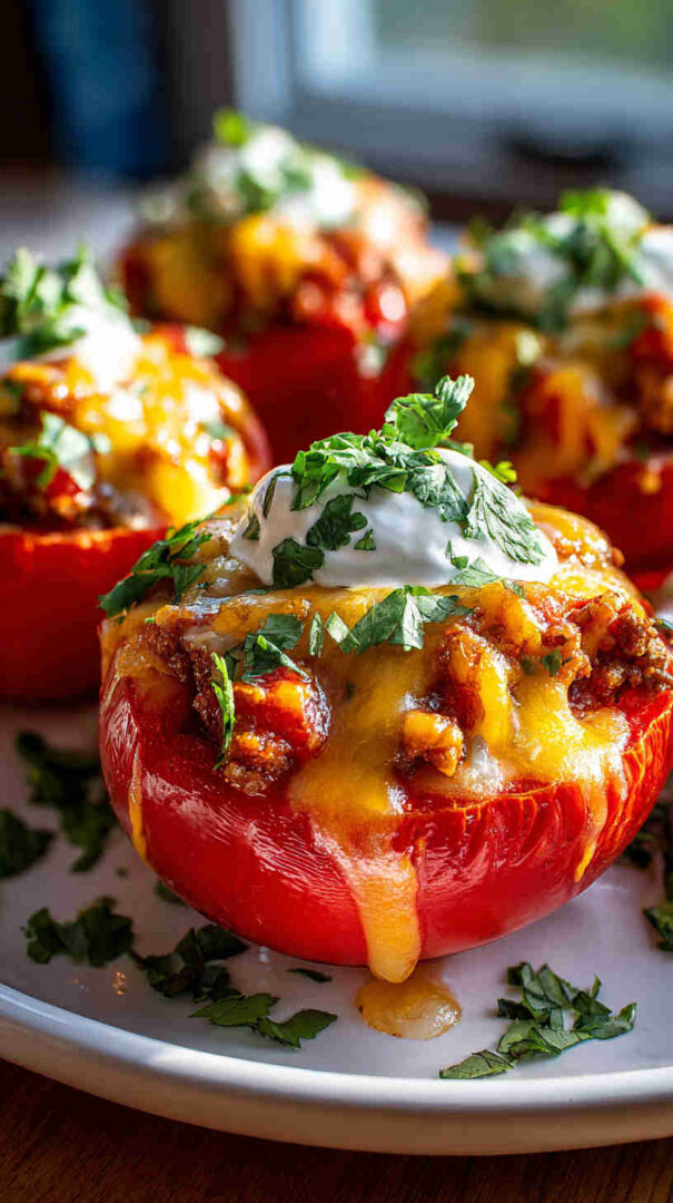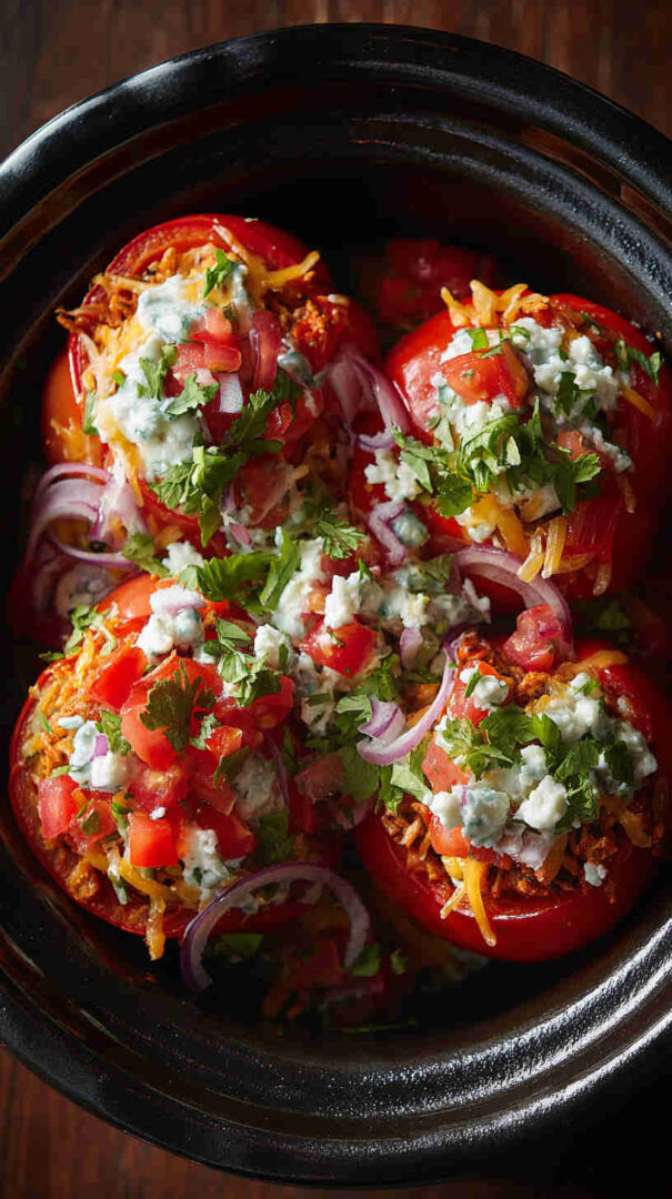 - Serve with fiesta flair! Carefully lift the taco-stuffed tomatoes onto plates using a slotted spoon. Spoon some of the sauce from the bottom over each serving. Garnish with fresh cilantro, a squeeze of lime, and your favorite toppings like sour cream or avocado. Serve with tortilla chips on the side if desired. These Crockpot Taco-Stuffed Tomatoes are fun, flavorful, and full of taco-night joy—enjoy every delicious bite!