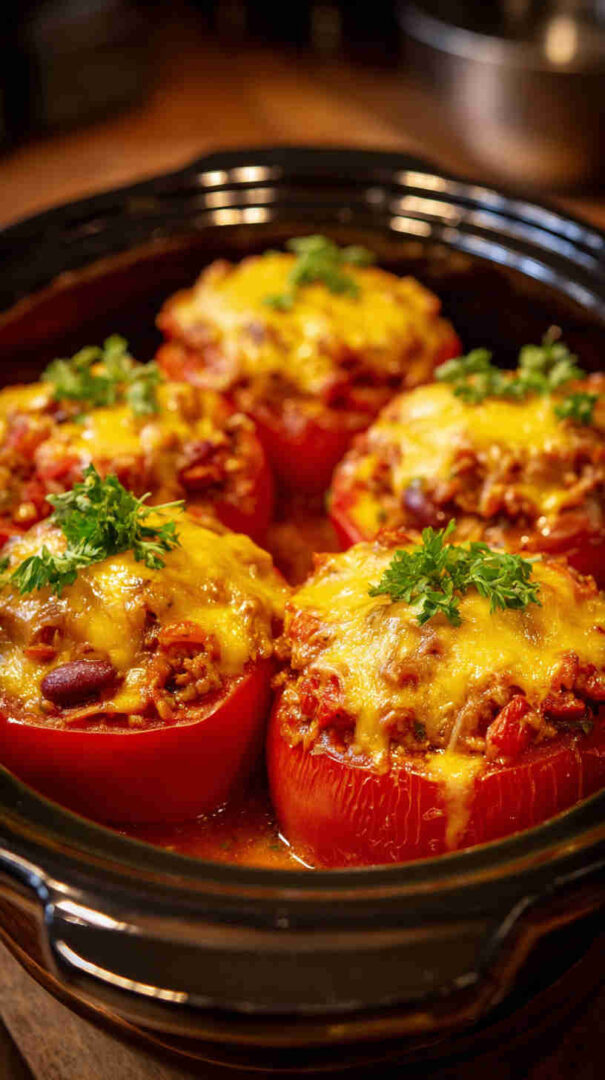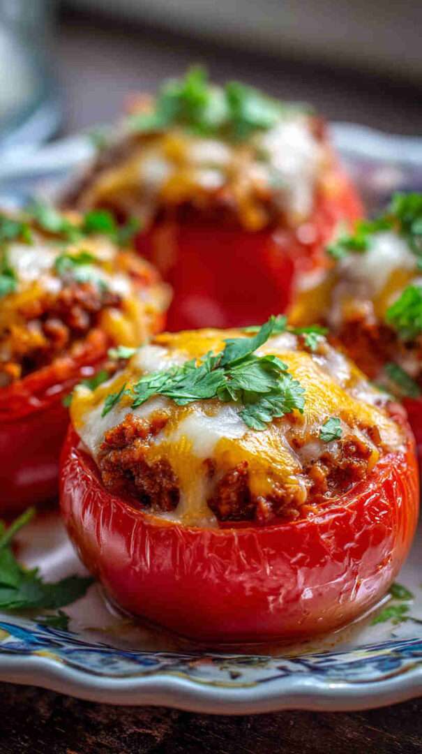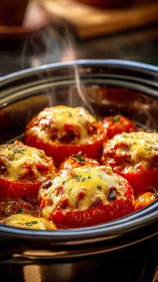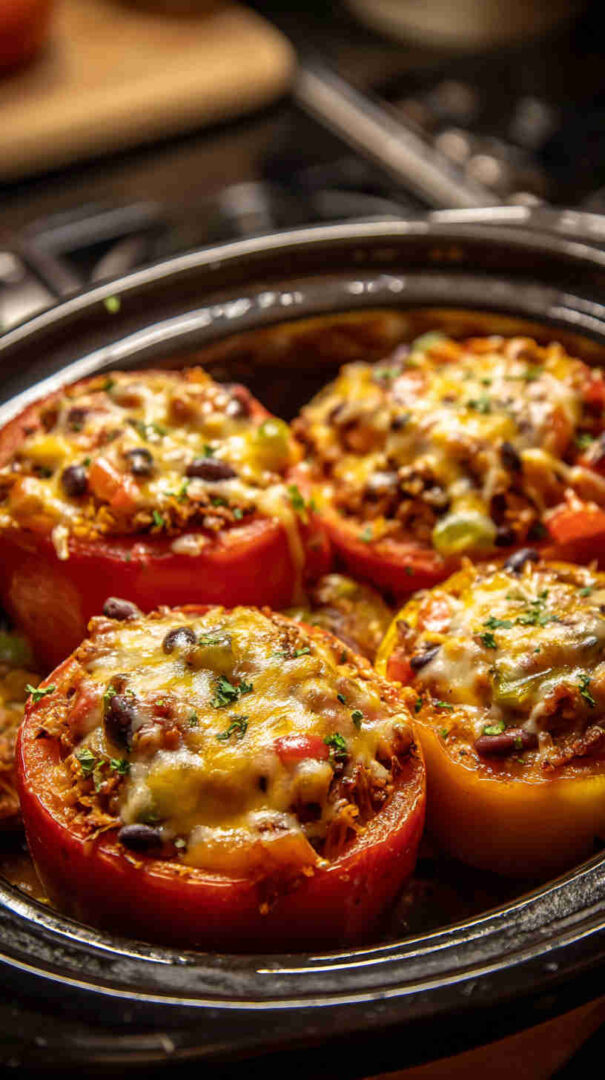 Drain excess fat and liquid from the filling to prevent the tomatoes from becoming soggy. Arrange the stuffed tomatoes snugly in the crockpot so they don’t tip over. Add cheese during the final 20–30 minutes for perfect melting. Taste the filling before stuffing and adjust the taco seasoning to your preferred spice level.