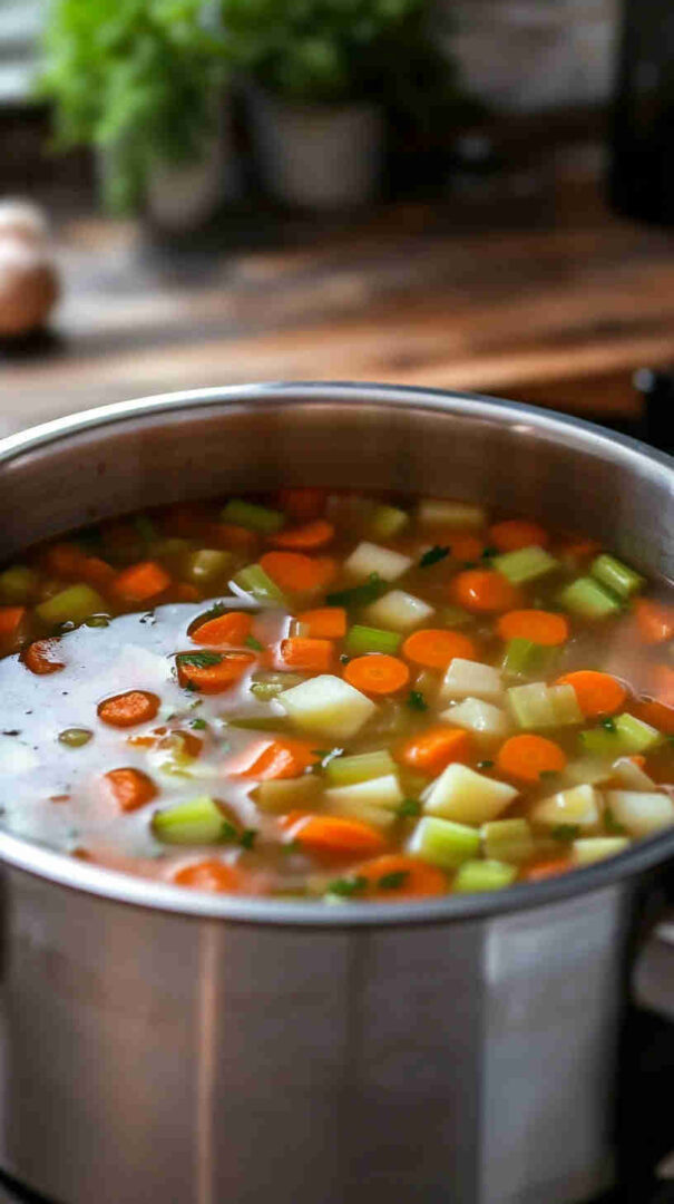 - Chop those veggies with love — Dice the onion, slice the celery, chop the carrots, and cube the potatoes into even pieces so everything cooks beautifully together. Mince the garlic too—aromas incoming!