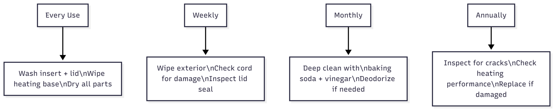 | Wipe heating base | After every use | Damp cloth, dry thoroughly |