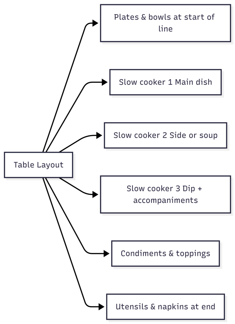 How you arrange the food determines how smoothly the party flows. A poorly planned setup creates bottlenecks, cold plates, and guests hovering awkwardly.