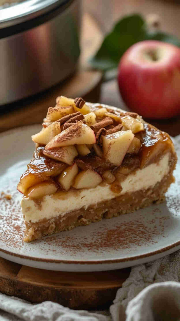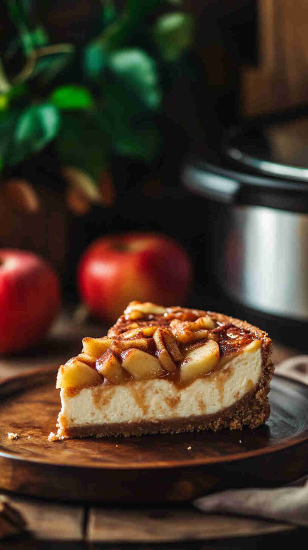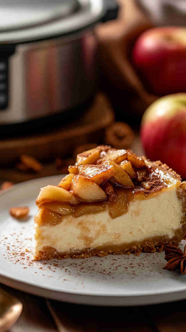 Creamy slow cooker cheesecake with cinnamon spice, graham crust, and warm apple topping—easy, crack-free fall dessert perfection.