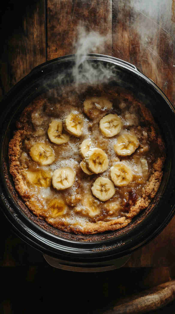 A warm, comforting slow cooker banana cobbler with caramelized fruit and soft, fluffy topping, perfect for effortless homemade dessert nights.