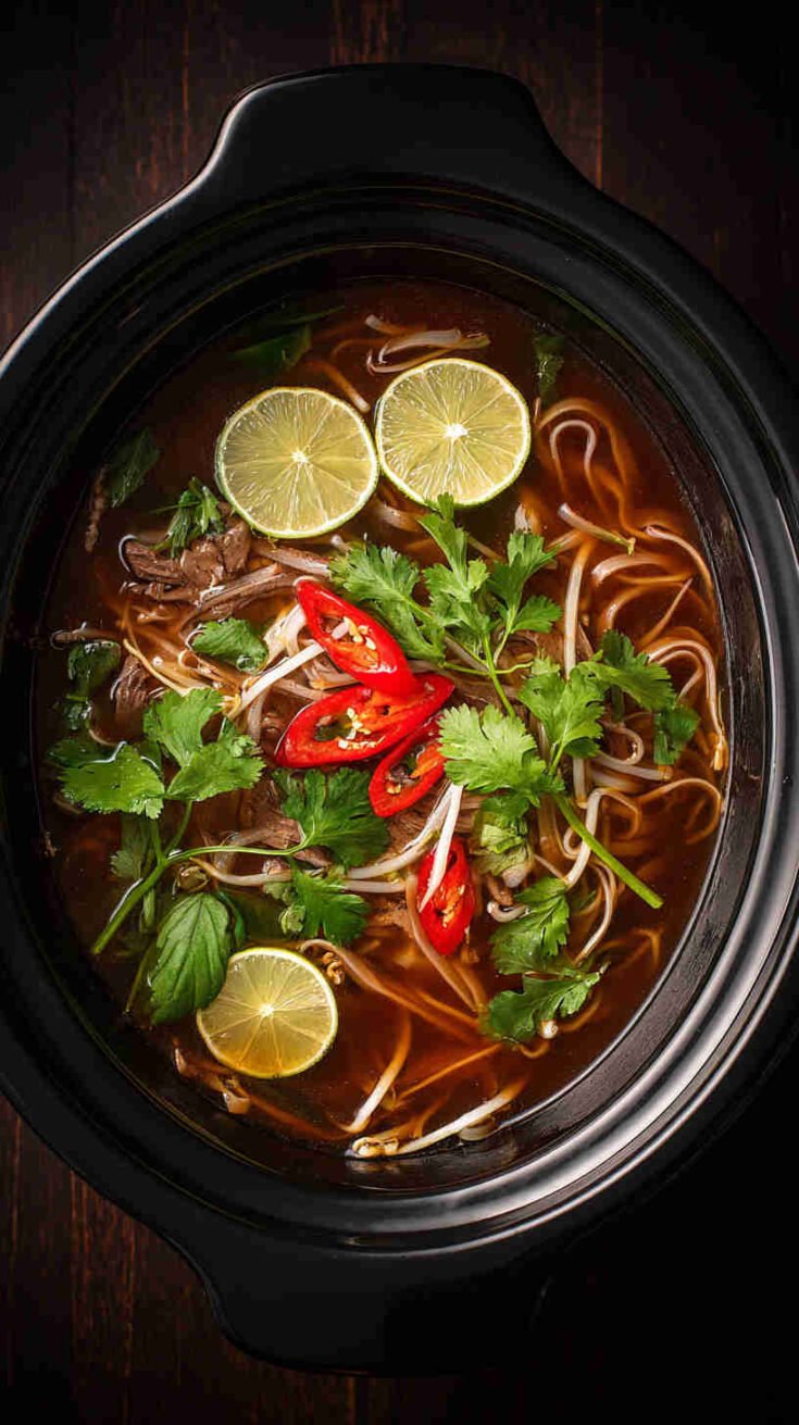 Fragrant Vietnamese beef pho simmers effortlessly in the slow cooker with tender meat and aromatic spices.