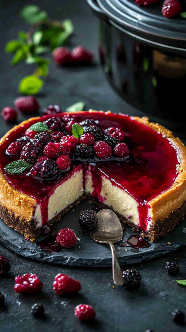 Creamy slow cooker cheesecake with buttery crust and swirled berry medley—easy, crack-free, and bursting with fresh fruit flavor.