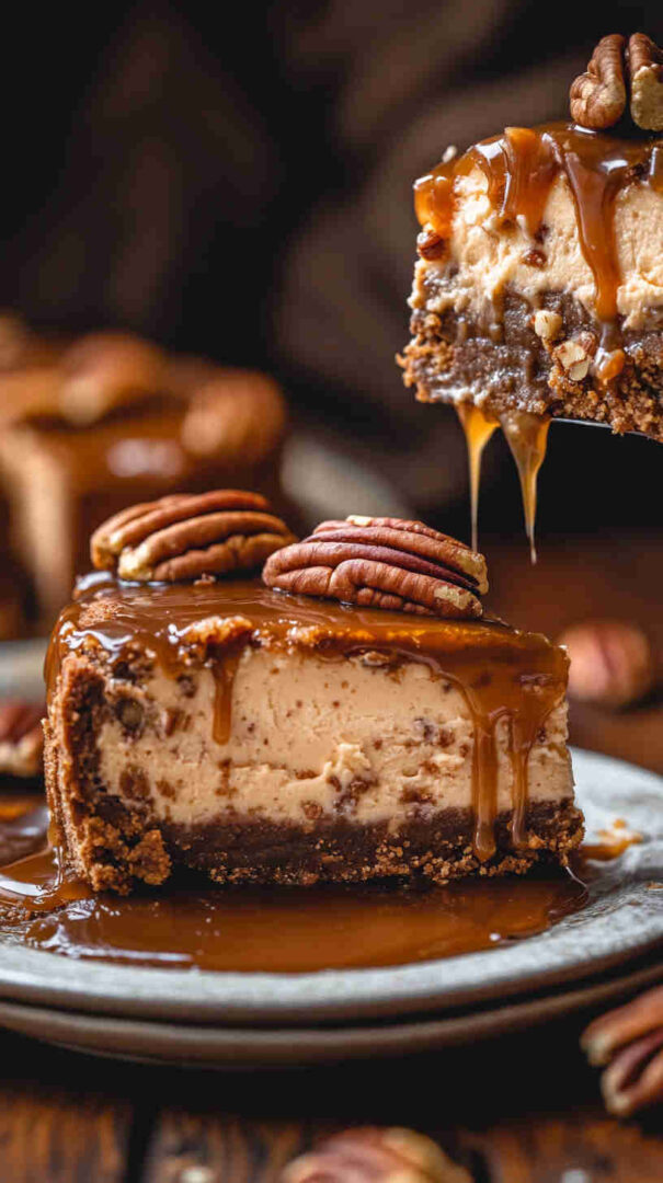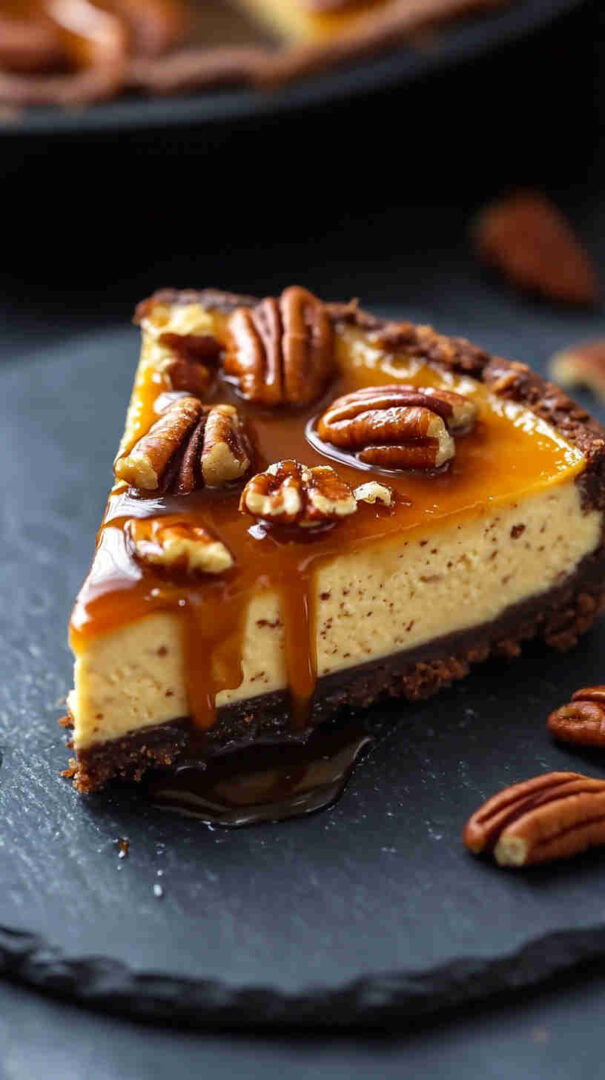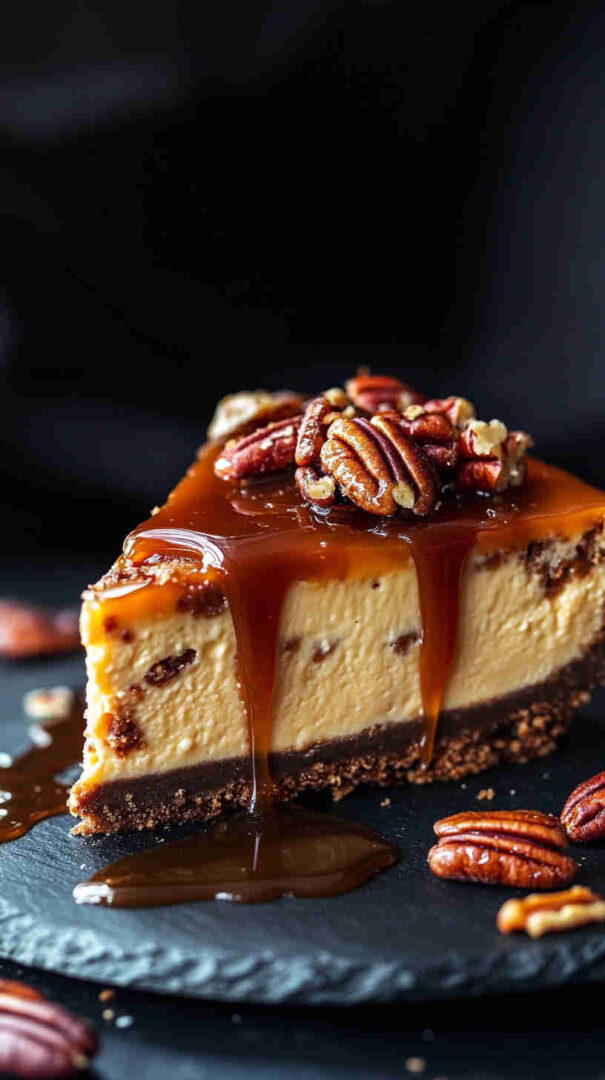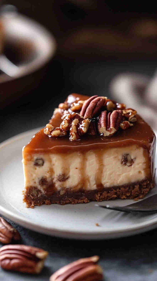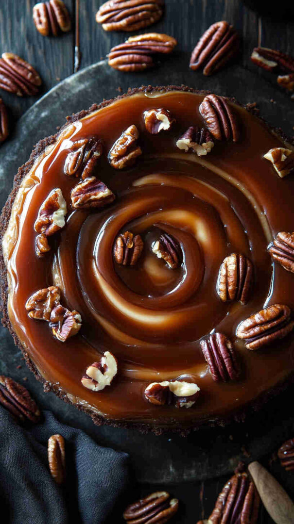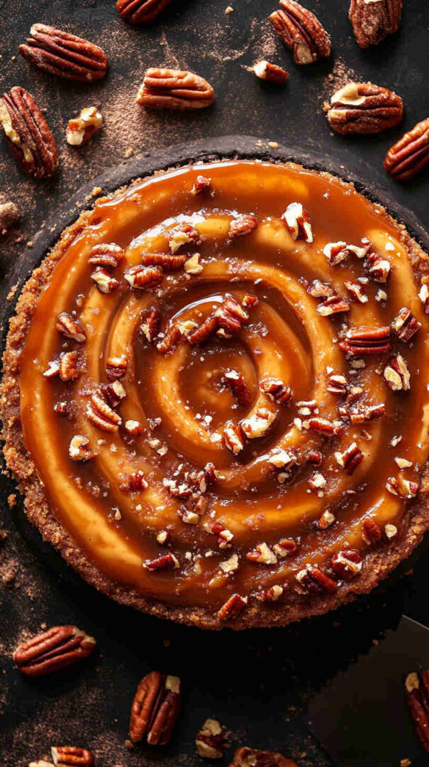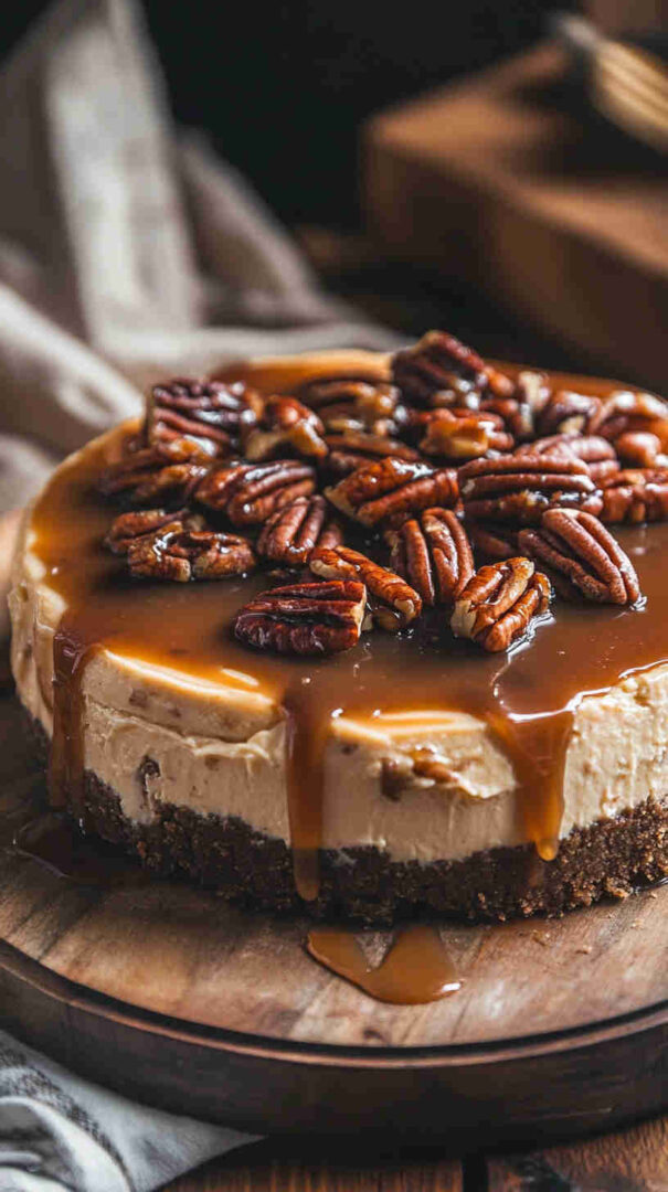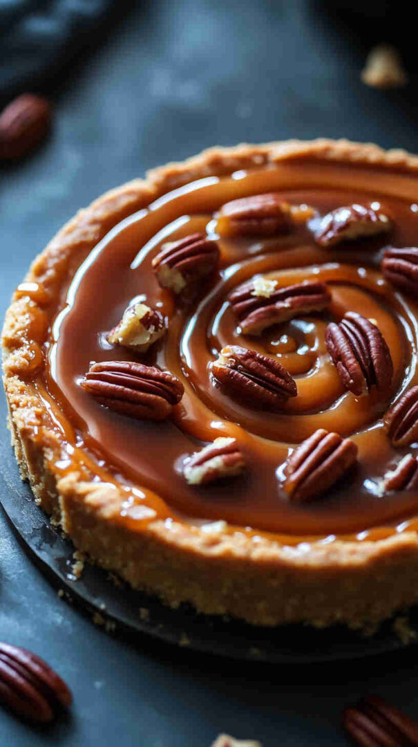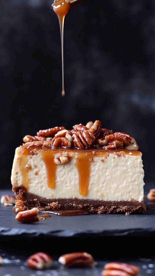 - Crown with caramel pecan heaven — In a saucepan, melt butter with brown sugar, cream, corn syrup, and salt over medium heat. Simmer 3–5 minutes until thickened. Stir in toasted pecans. Cool slightly, then spoon generously over chilled cheesecake. Slice and enjoy every decadent bite!