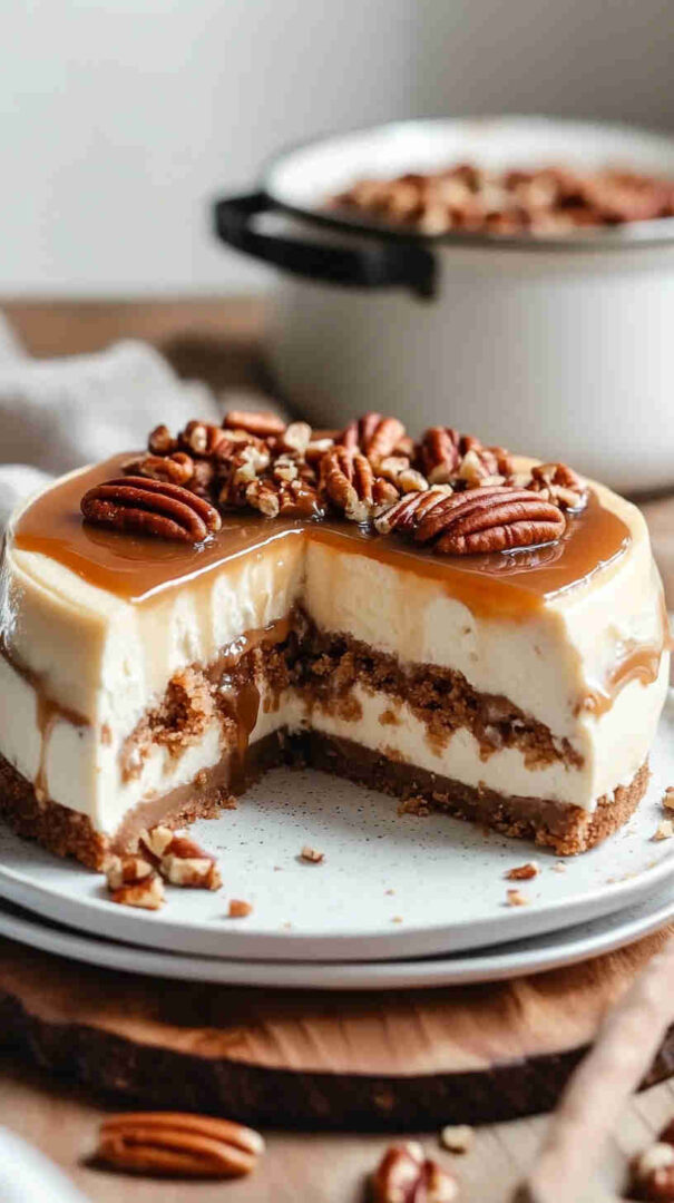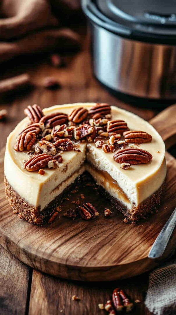 Creamy slow cooker cheesecake with pecan crust, topped with gooey caramel and crunchy toasted pecans—decadent and easy!