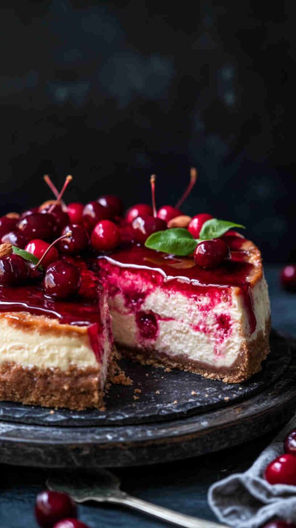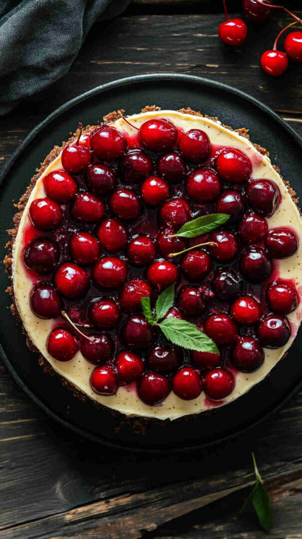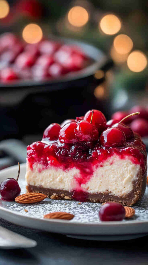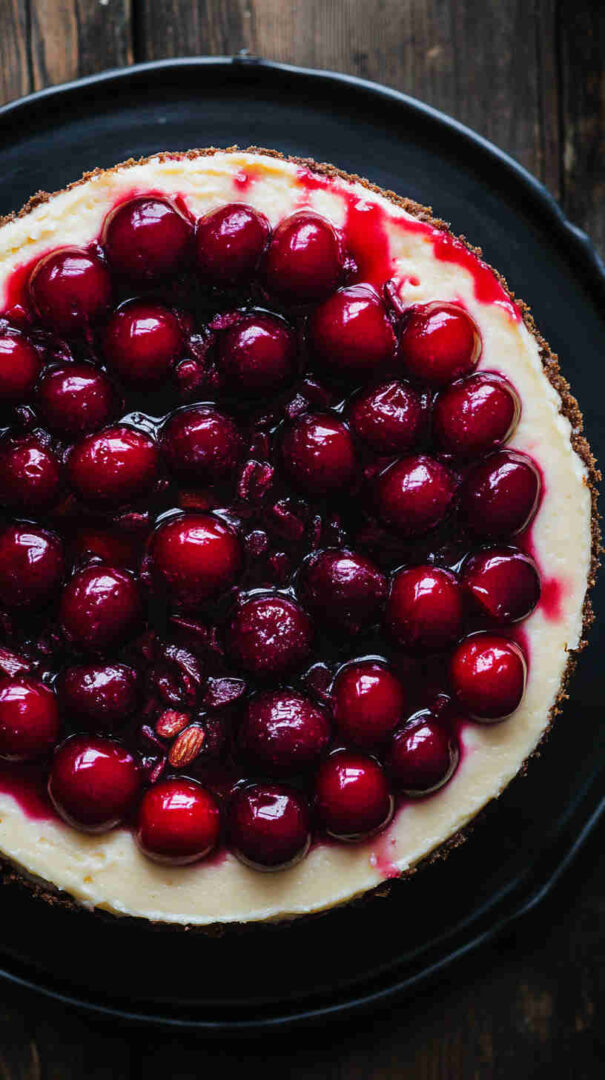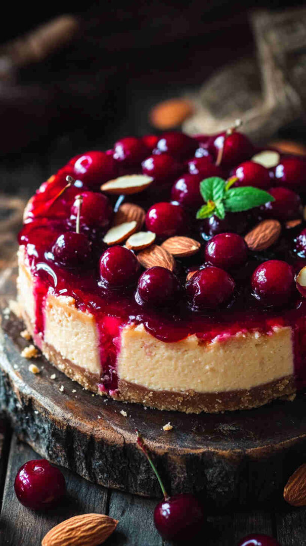 - Top and serve with joy — Just before serving, spoon cherry pie filling generously over the top. Sprinkle with toasted sliced almonds if you like extra crunch and elegance. Slice, serve, and watch everyone swoon!