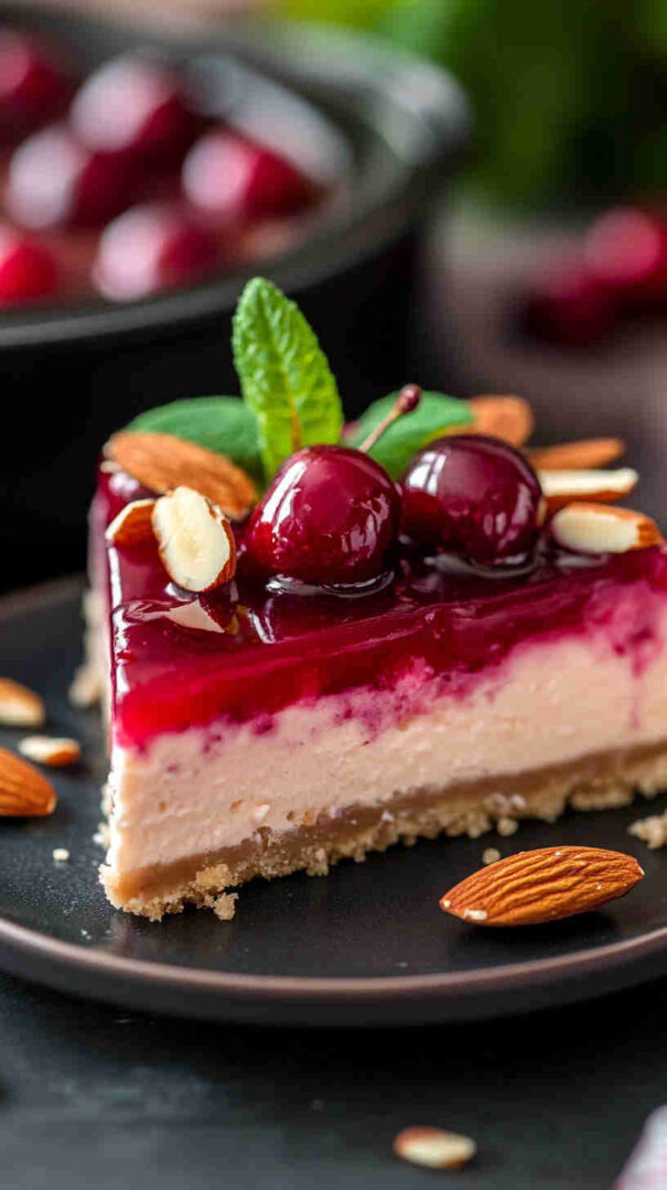 Creamy almond cheesecake cooked in the slow cooker, topped with luscious cherries—easy, crack-free, and deliciously indulgent.