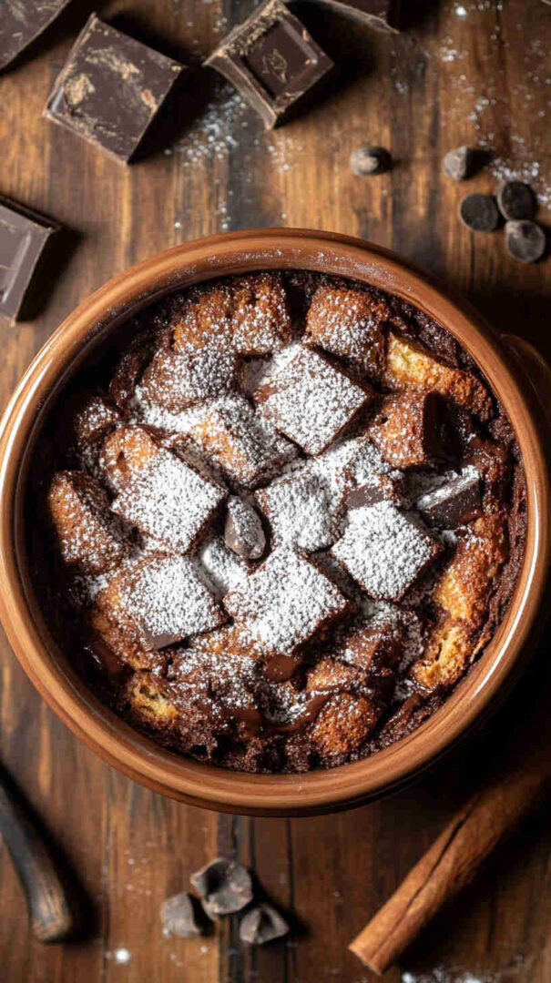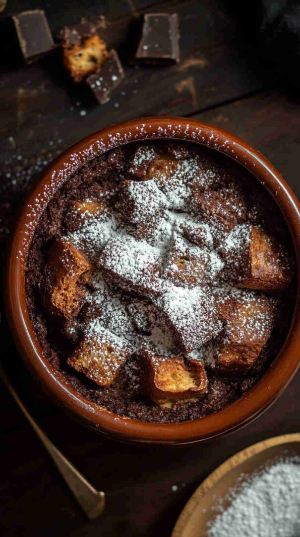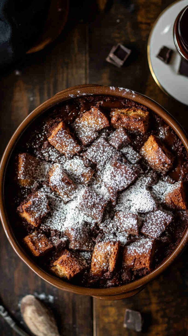 Stale or day-old bread soaks up a luscious custard infused with real chocolate, creating that dreamy contrast of crispy edges and ultra-soft, pudding-like centers loaded with melty chocolate pockets in every bite. It fills your home with an irresistible aroma that screams comfort and warmth.