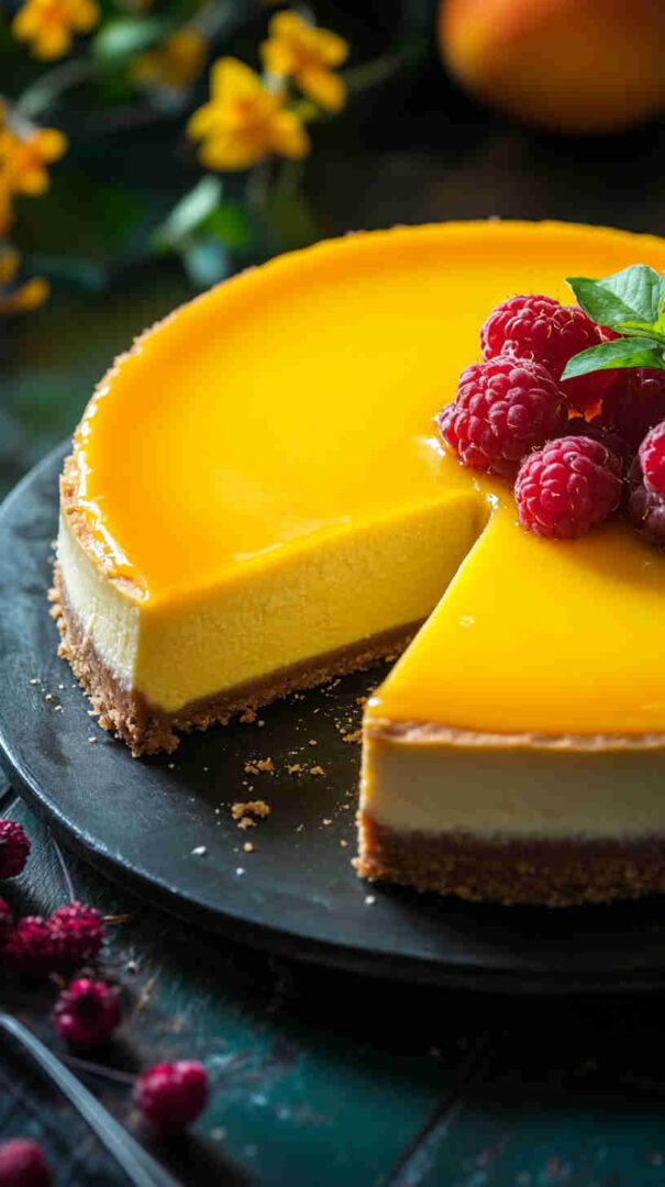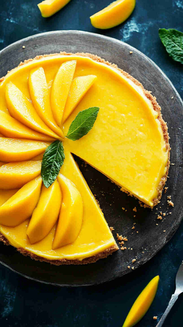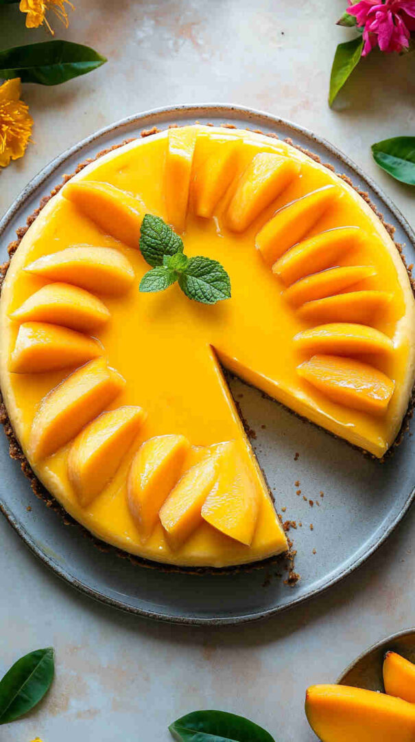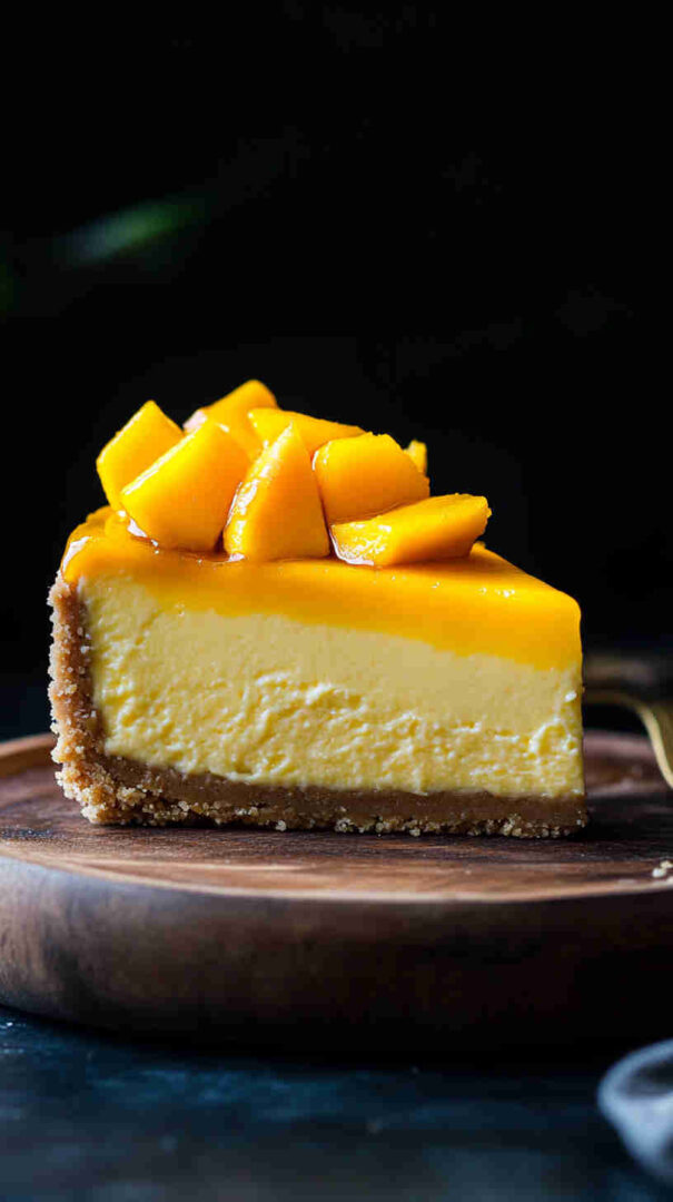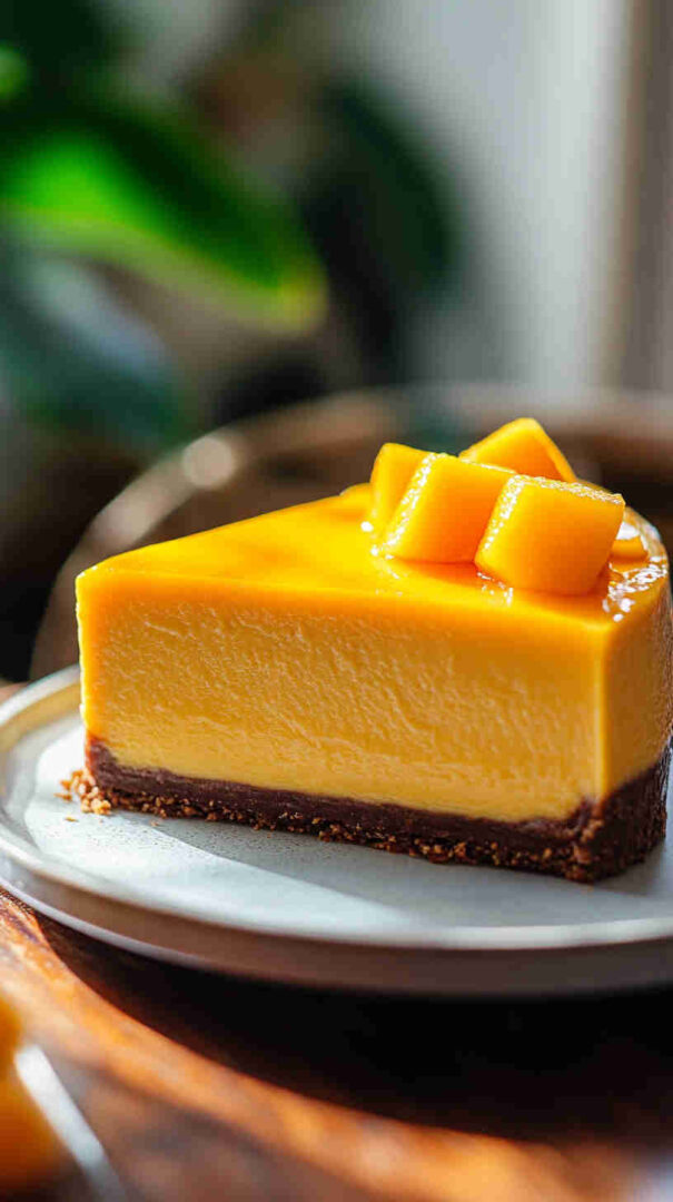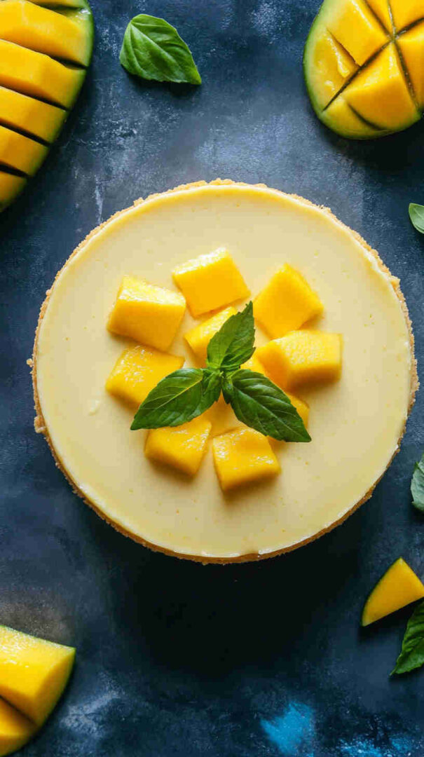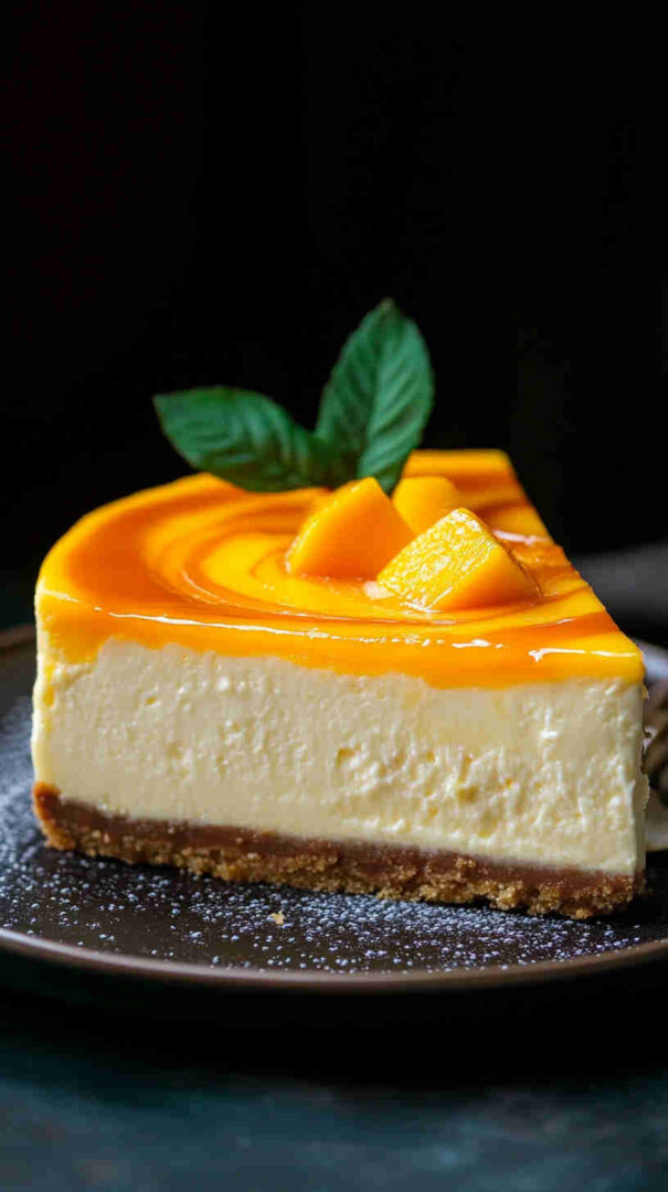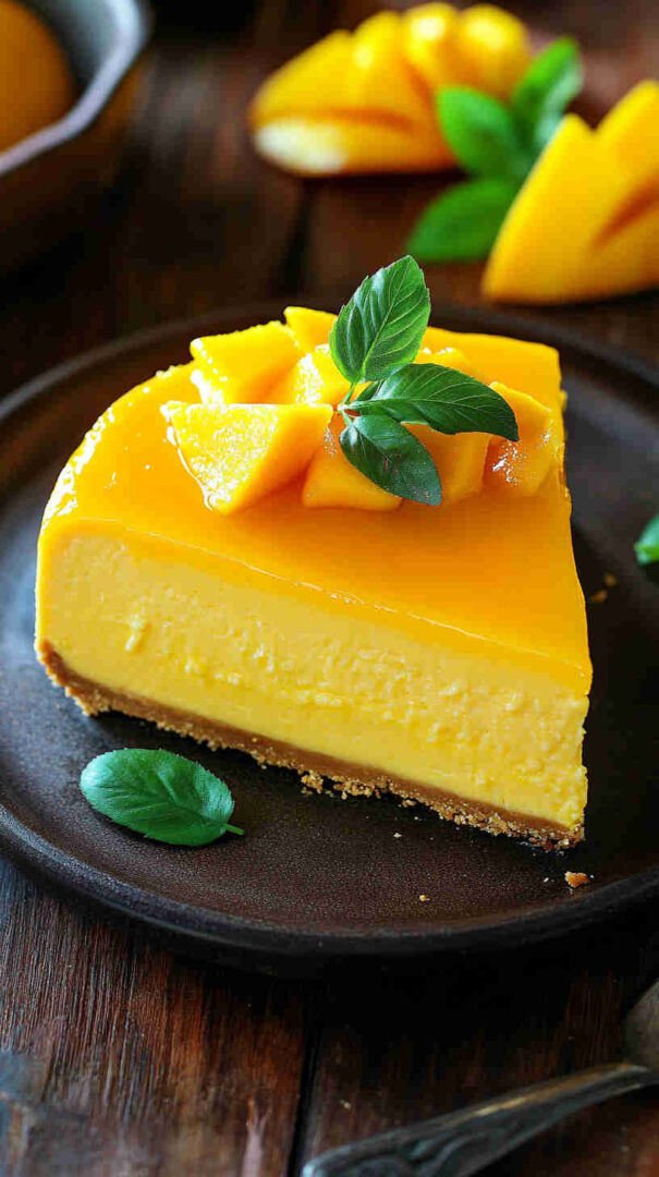 For a vegan version, swap cream cheese with plant-based blocks, use coconut yogurt instead of sour cream, and agar or cornstarch for setting. Add passion fruit puree for extra tang or swirl in raspberry for a marbled effect. Use digestive biscuits or gingersnaps for the crust to add spice. Substitute mango with pineapple or peach puree for different tropical twists.