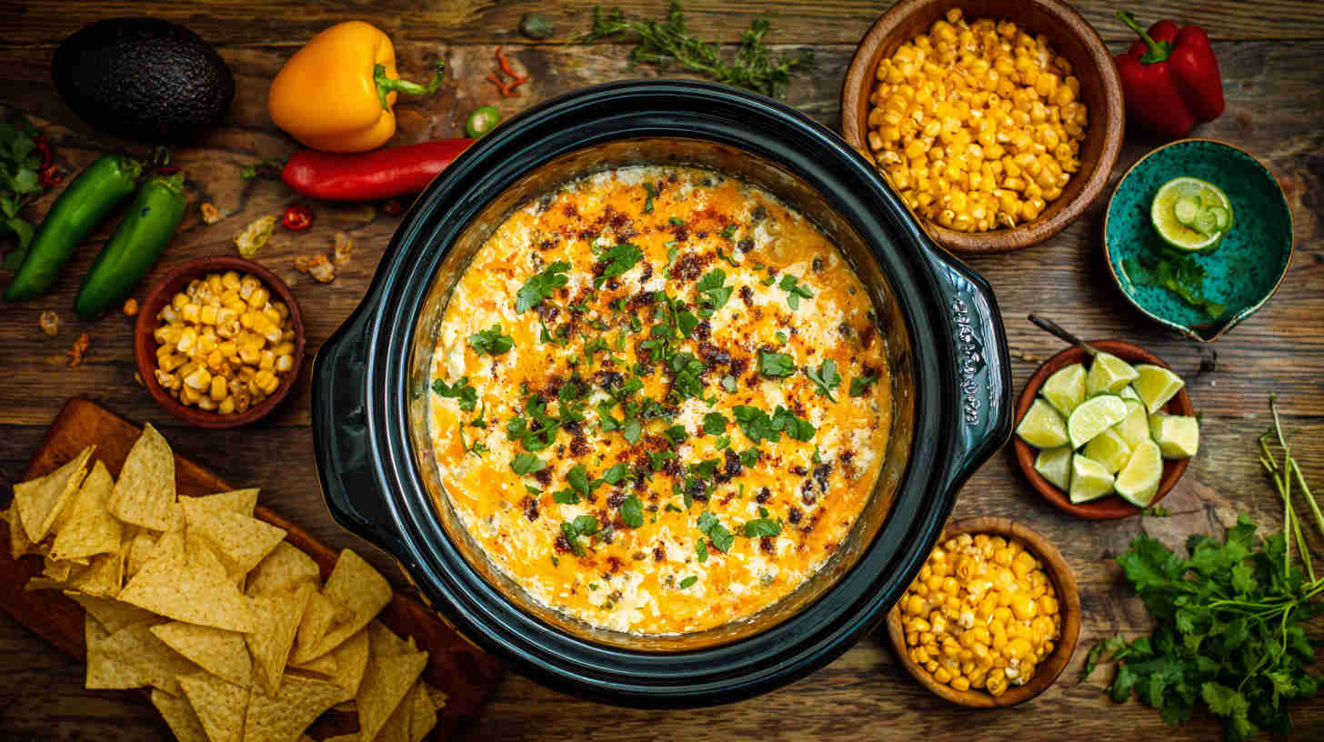 Creamy, cheesy slow cooker dip bursting with elote flavors—sweet corn, lime, Tajín, and cotija for party-perfect scooping.