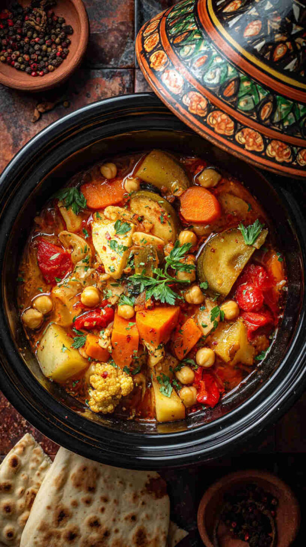 Indulge in the vibrant flavors of Morocco with these slow cooker vegetable wraps, where tender chickpeas, carrots, zucchini, and eggplant simmer in a fragrant blend of cumin, cinnamon, and harissa. Wrapped in warm flatbreads with cooling yogurt and fresh herbs, this global street food-inspired dish delivers hearty, plant-based comfort that’s effortlessly exotic and satisfying for any meal.