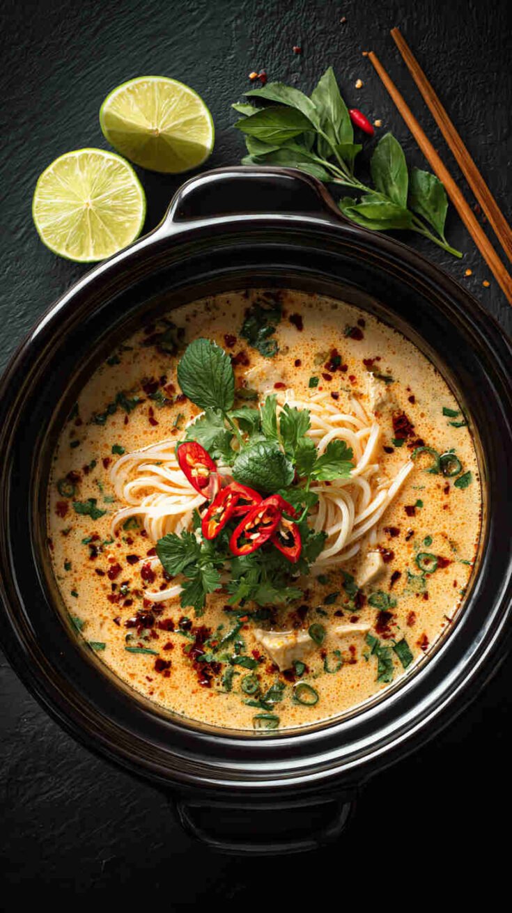 Aromatic Thai coconut curry noodle soup simmers effortlessly in the slow cooker—vibrant, cozy dinner.