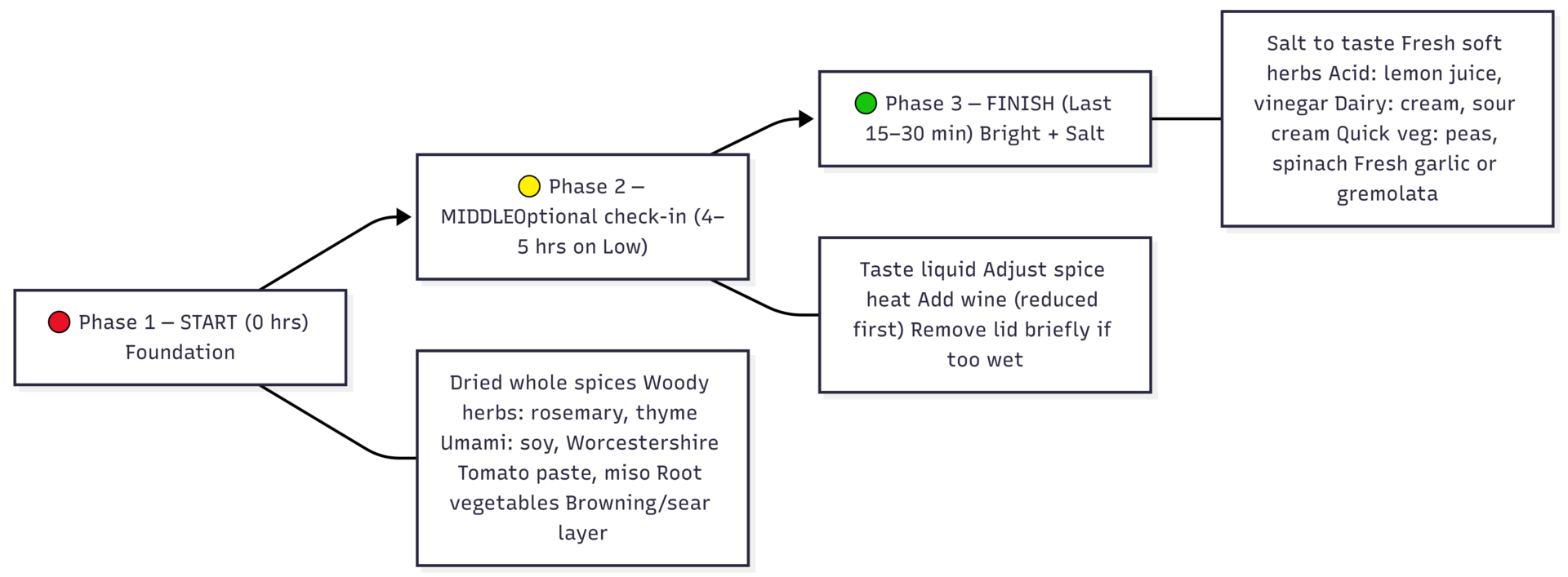 Every well-seasoned slow cooker dish follows a three-phase structure. Think of it as building a flavor foundation at the start, developing the middle, and finishing bright at the end.