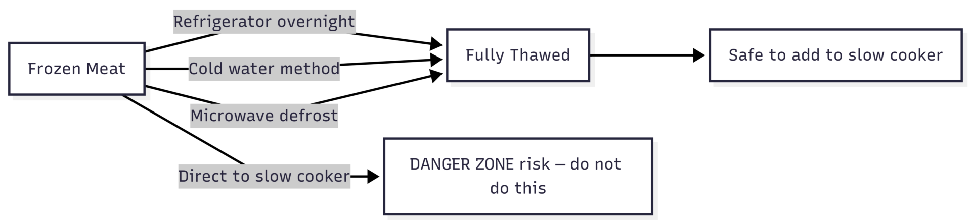 | Using frozen meat | Bacterial danger zone risk | Thaw completely first |